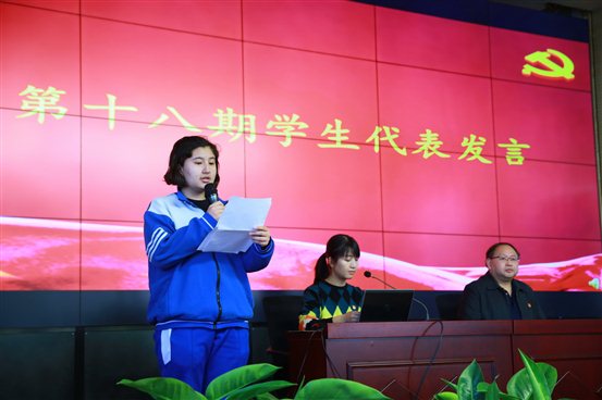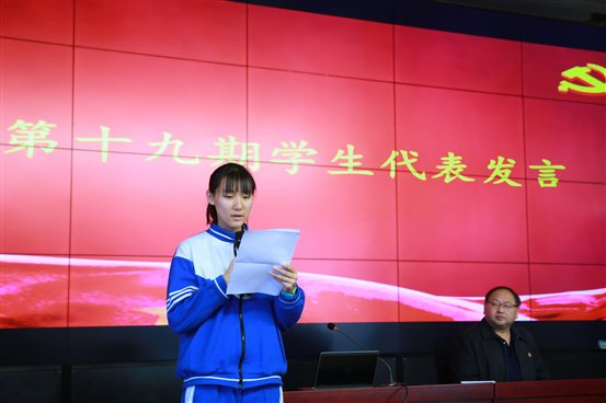 典礼在庄严的高唱国歌仪式中拉开帷幕,高一1班杨子欣作为第十九期党校学生代表进行了发言,她首先感谢学校能给全体学员这次成长和学习的机会,并代表全体学员向党组织郑重宣誓:认真上好每一堂党课,在今后的学习和生活中严格要求自己,争取早日加入中国共产党。