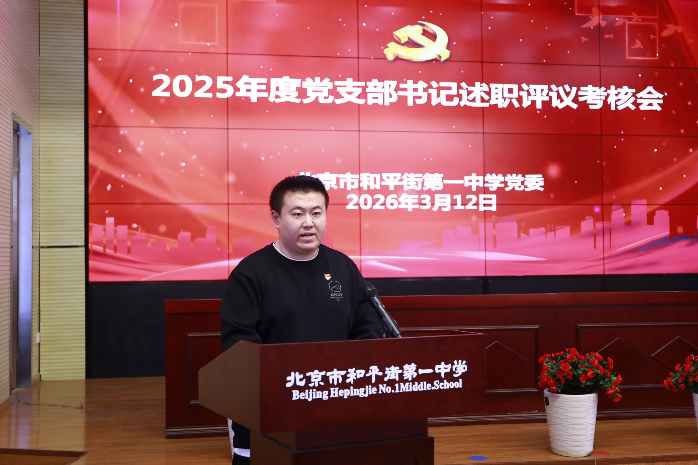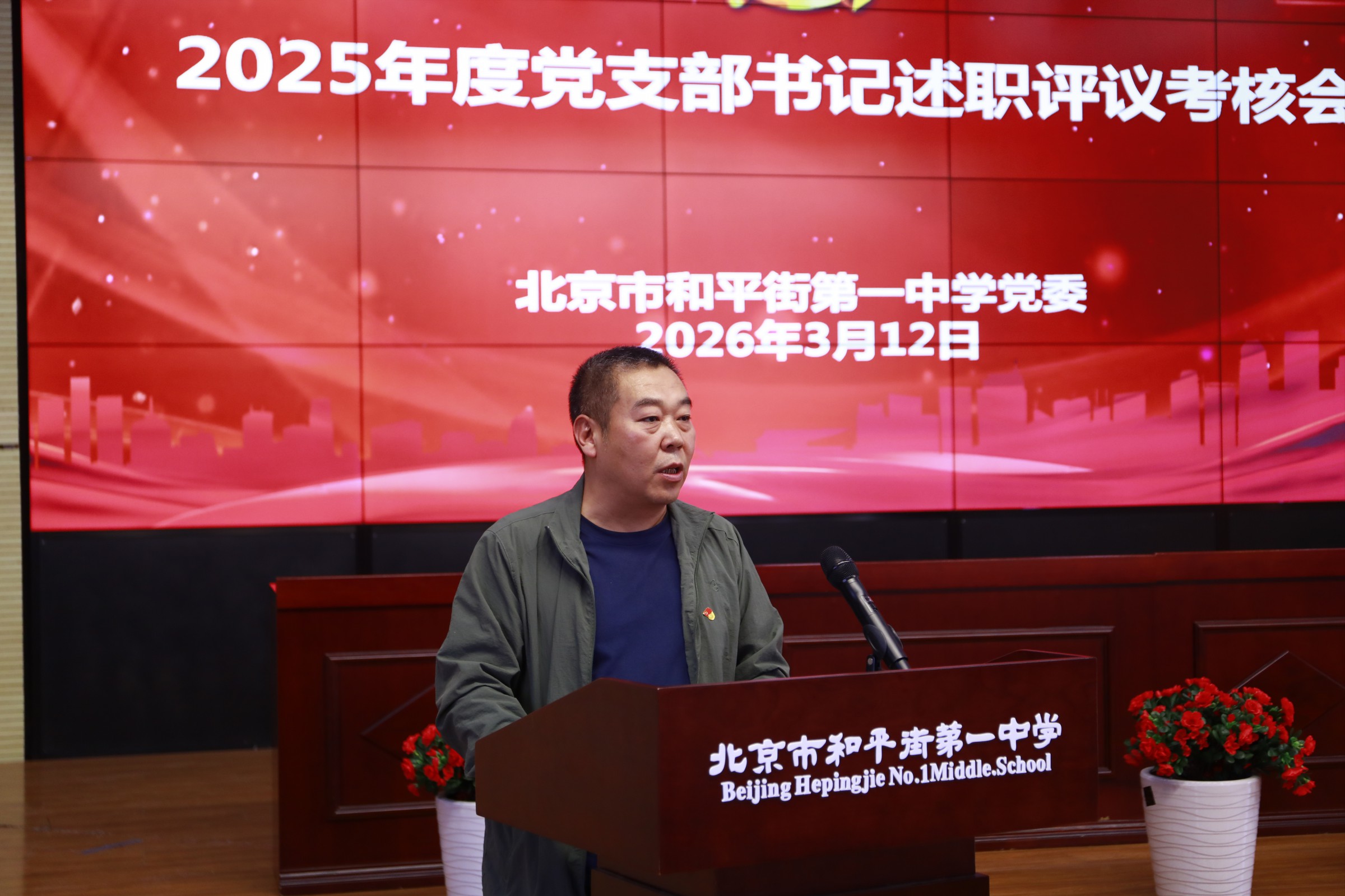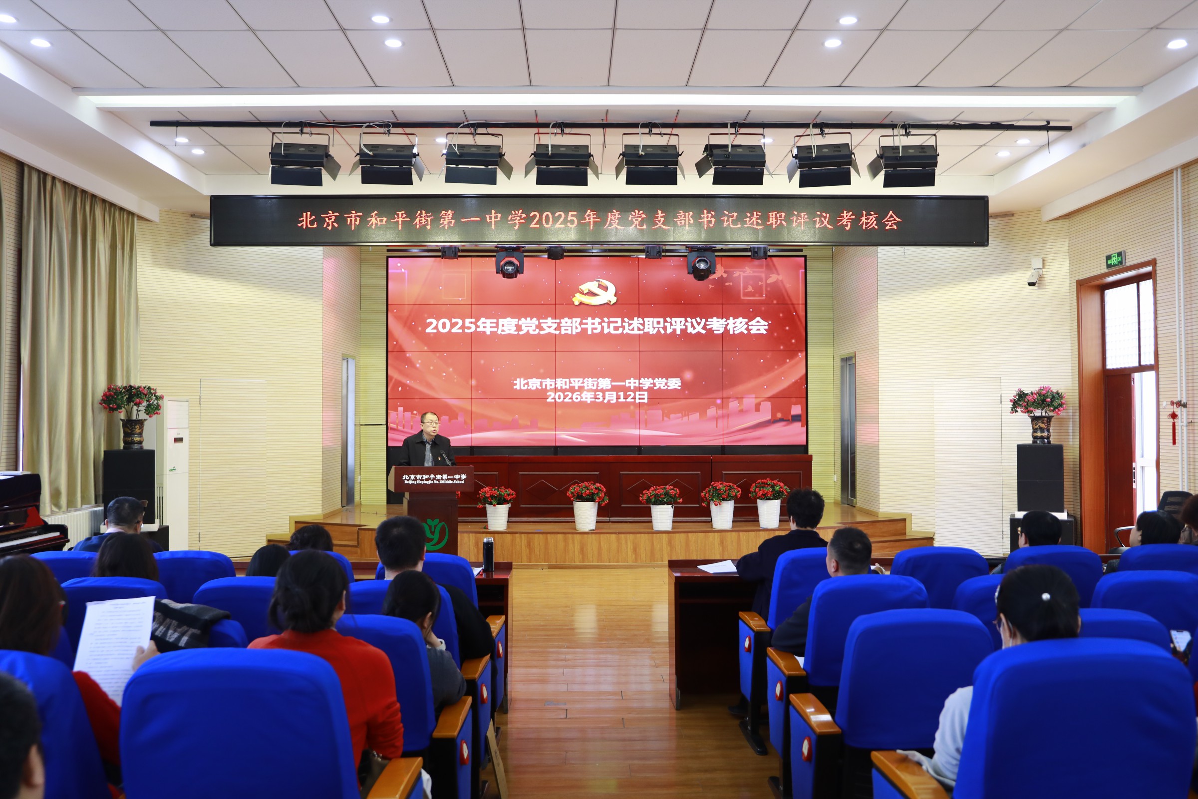 为进一步压实党支部书记抓党建“第一责任人”职责,全面提升学校基层党建工作质量和水平,2026年3月12日下午,北京市和平街第一中学党委在和平街高中校区报告厅召开2025年度党支部书记抓党建述职评议考核现场会。会议由党委书记王松同志主持,党委委员、党总支书记、各校区党支部书记及党员代表参会。