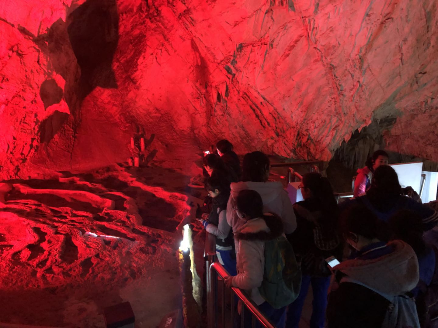 同学们首先来到了位于北京市房山区的石花洞。石花洞形成于多次的造山运动和溶蚀过程,有着独特的岩溶洞穴资源,以其典型性、完整性和稀有性享誉世界。其中的洞穴沉积物还记录了地球的演化历程和沉积环境的变化,是一处研究古地质环境变化的重要信息来源。洞中有滴水、流水和停滞水沉积而成的多种钟乳石,其又组合形成了千姿百态的景观,如石笋、石竹、石幔、石瀑布、石梯田等,惟妙惟肖,美不胜收,让同学们不禁感叹大自然的鬼斧神工。