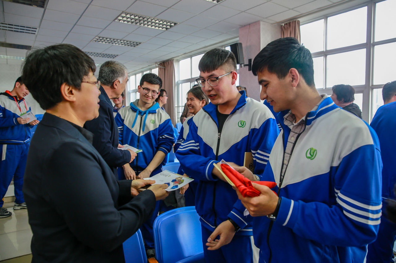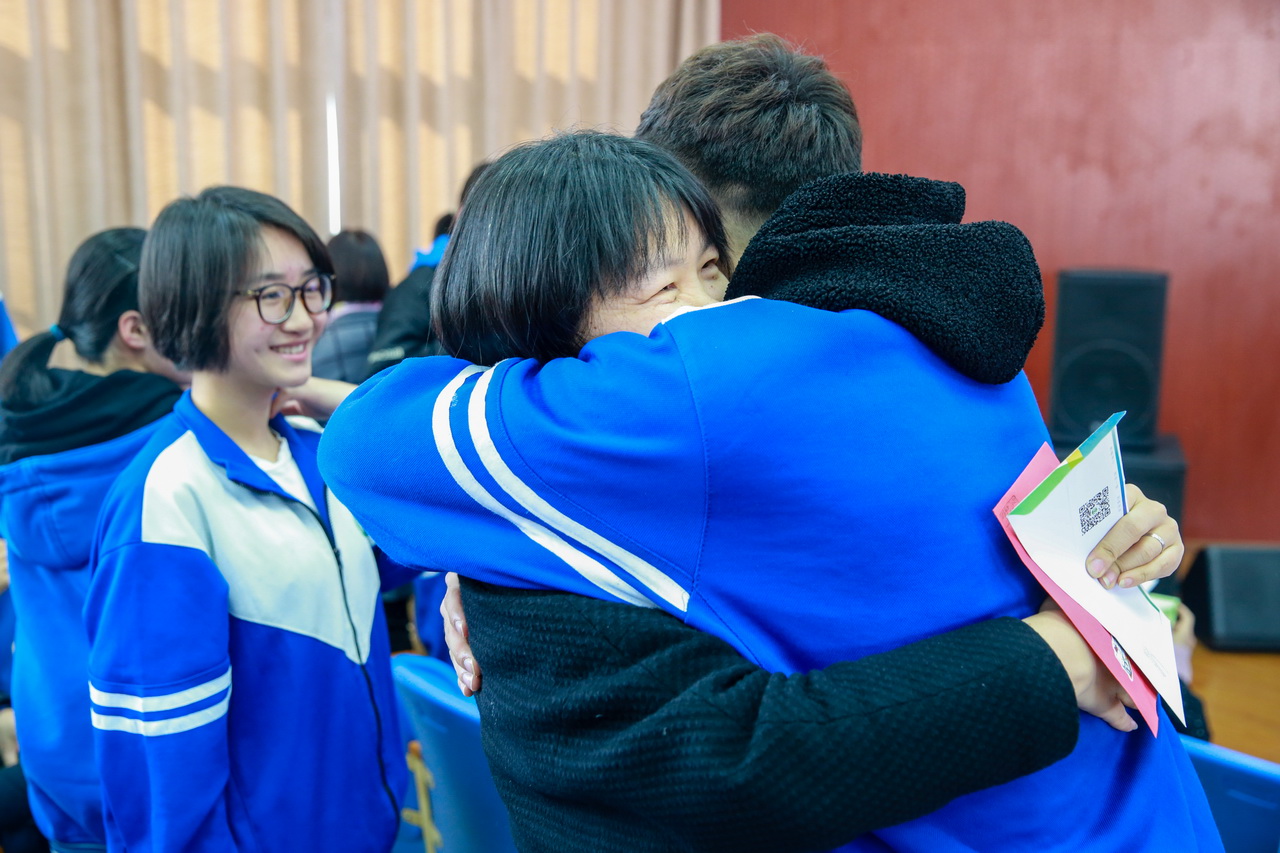 最后,学生亲手将自己制作的成人礼邀请函郑重的交到父母手上,为接下来的成人仪式做一个温暖的传递。内地新疆高中班学生把自己的邀请函送给了北京的“爸爸妈妈”,就是学校的中层干部、学生发展处老师和全体高三教师。