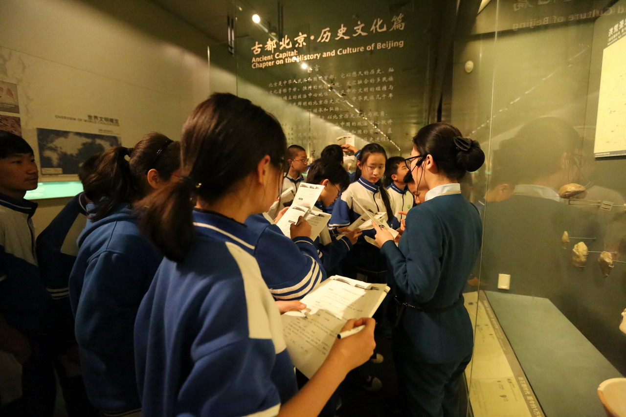在博物馆内,同学们都紧紧追随讲解老师,了解了北京的历史变迁,古代的陶器、瓷器、玉器和民俗等传统文化。 大家都惊叹于先民所拥有的智慧和灵巧,感慨于历史的变迁,真正近距离地认识到了先民的勤劳智慧,了解了北京。