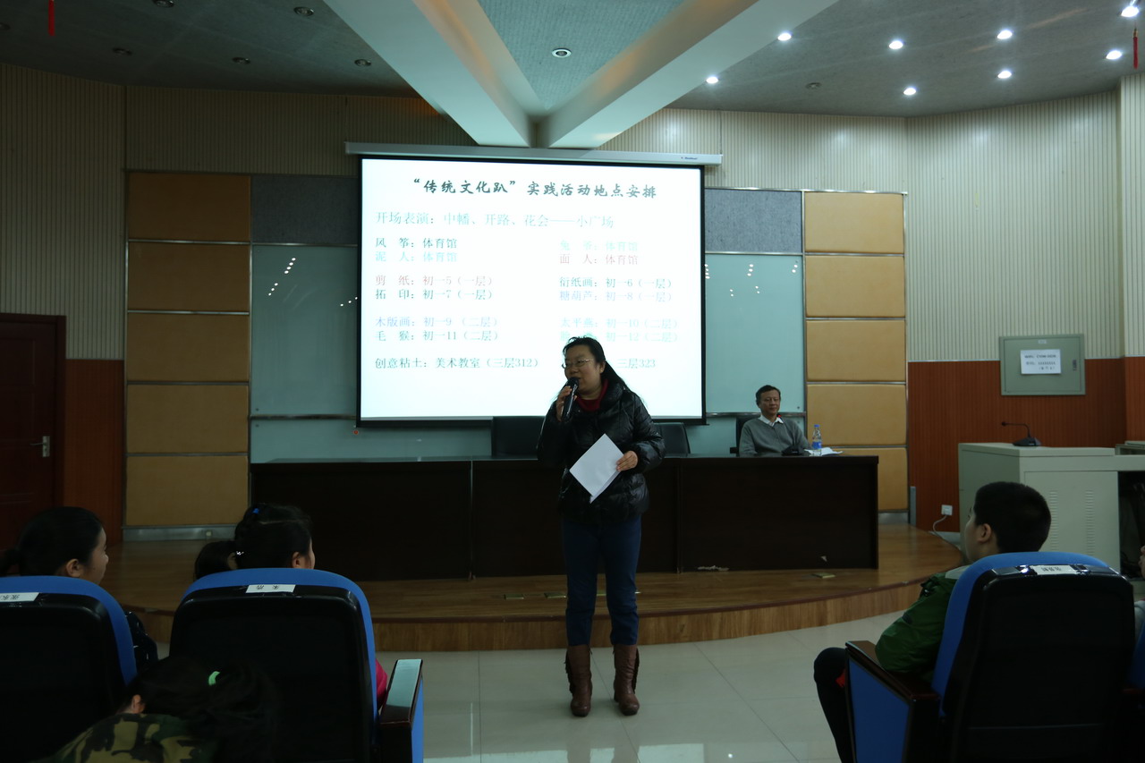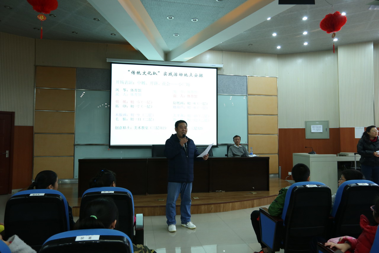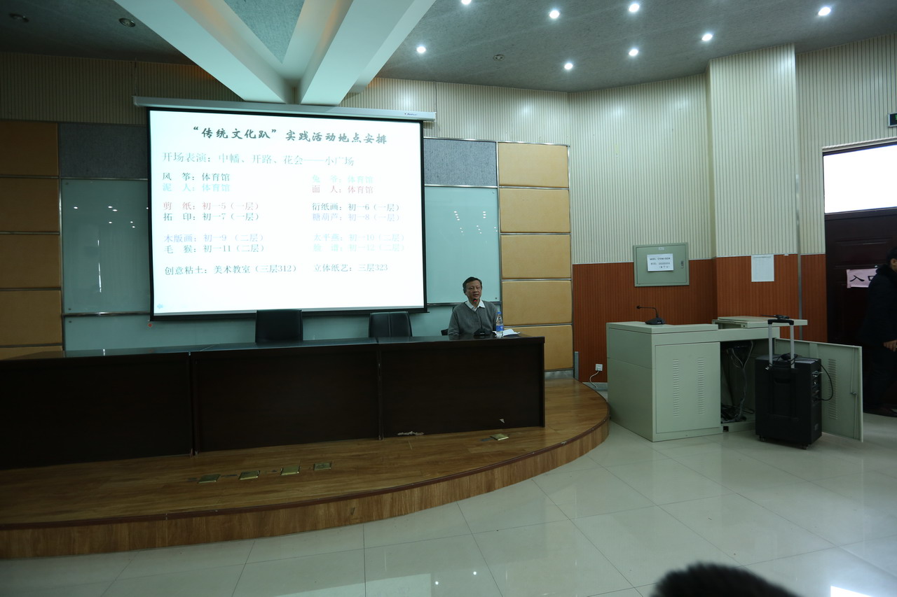 活动当天,先在朝来校区阶梯教室举行了简短的开幕式,张景鲜副校长致欢迎辞,欢迎六年级学生的再一次到来,希望他们能够享受传统文化的熏陶,弘扬中华民族传统文化艺术。北京市民俗协会高巍会长为学生做关于中华传统文化和非物质文化遗产的专题讲座。张东辉主任简单地介绍活动的规则,同学们有秩序地来到小广场观看传统文化展示,分别是开路和中幡,观看的过程中,学生们自发地为艺术家们的表演拍手叫好。