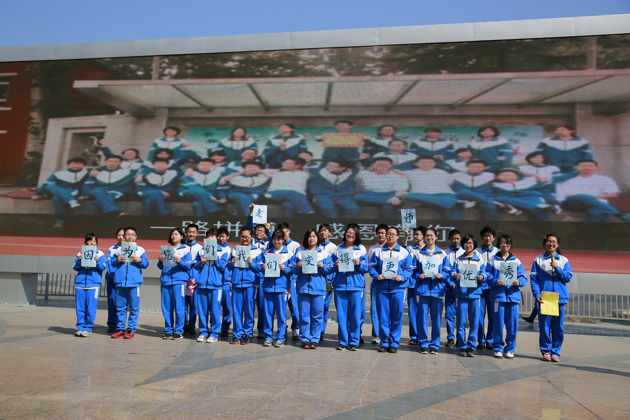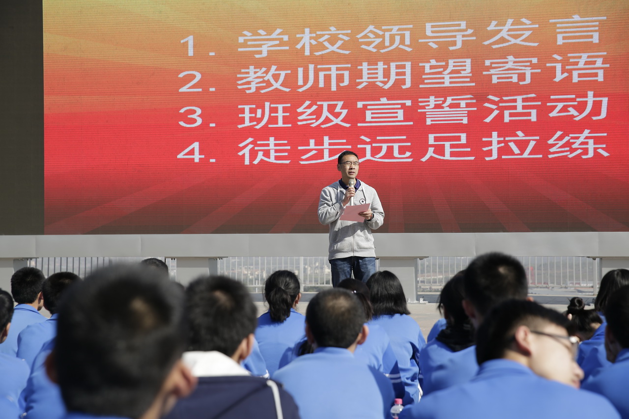 张信海主任在大会上讲话,希望同学们在七十天的时间里,与自己拼搏、磨砺意志、培养团队精神、创造奇迹、终成正果。随后,初三年级全体教师在黄国会主任的带领下,向全体同学送上寄语,希望同学们挑战自我,努力向前,决胜六月。最后,四个班的同学们轮流表态,既回顾了过往三年的青葱岁月,也感怀师恩,更表达了他们最后冲刺的决心!