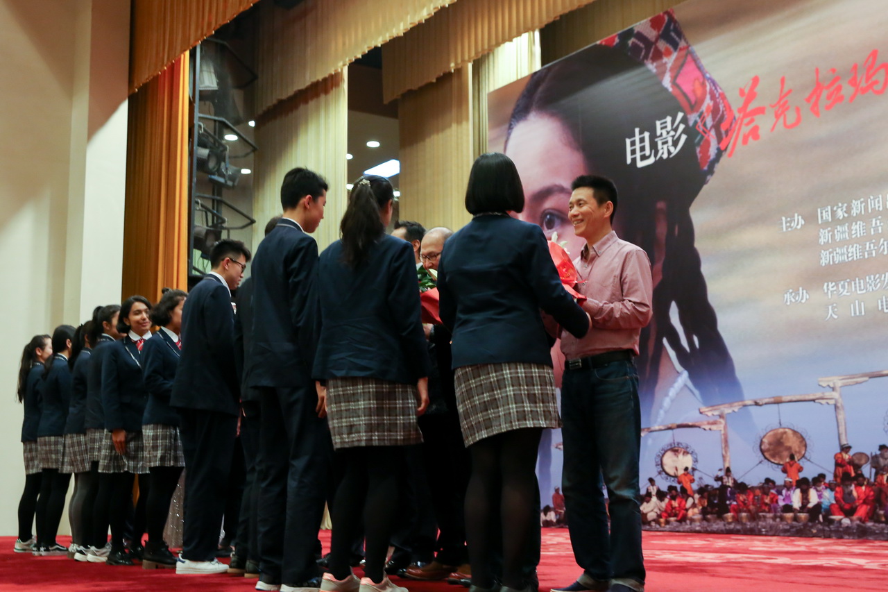 和平街一中学生还作为代表为电影主创人员现场献花。同学们被电影主人公阿依古丽不惧极端宗教势力影响最终实现梦想的事迹所感动,被“走亲戚干部”的浓浓大爱所震撼,纷纷流下了感动的泪水。首映式结束后,同学们纷纷与电影主角、导演、编剧合影留念。