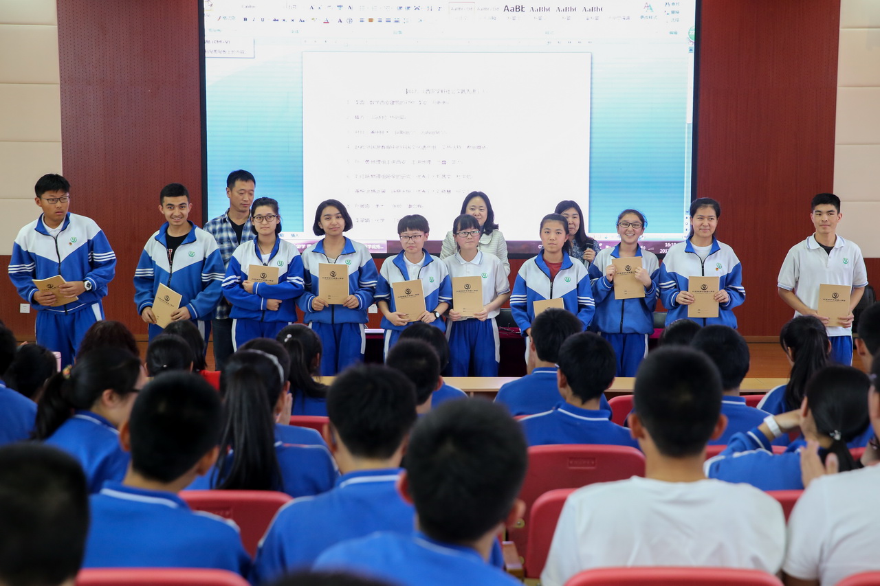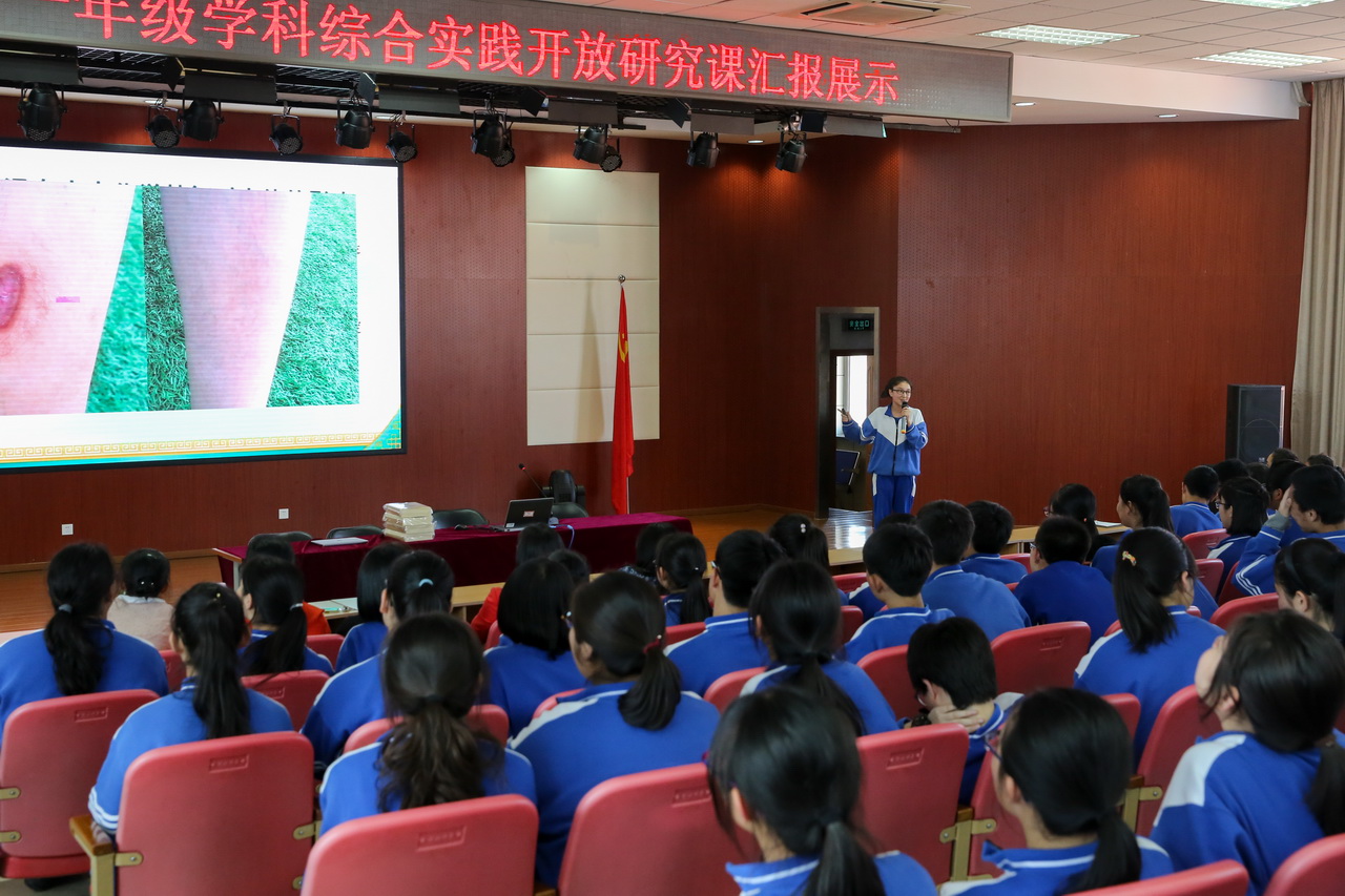 李翠娟老师宣读了本次学科综合社会实践开放性研究课中的优秀学生和小组名单,周建萍副校长、王军主任为以上学生现场颁奖。