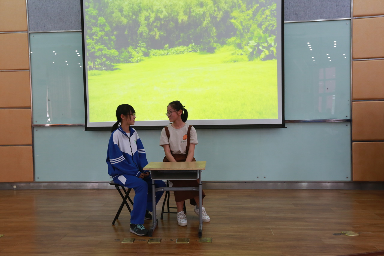 在配音比赛进行到一半时,英语小组的同学们为大家表演了由《爱丽丝梦游仙境》改编的英文小短剧。同学们有条不紊、生动形象的演出,仿佛把大家带到了仙境里,和爱丽丝一起体验了一回“穿越”。还有两位同学为大家推荐了2部优秀的英文影片:《寻梦环游记》和《奇迹男孩》,他们对电影的主要内容做了大致介绍,并分享了自己的观后感,激发了同学们对英文电影的兴趣。