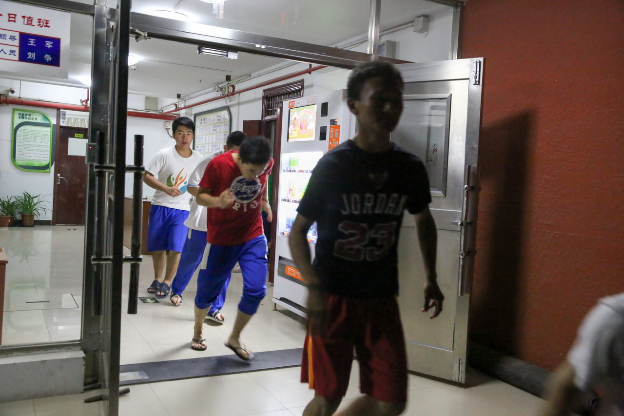 第三节晚自习后,所有住宿生回到宿舍,像往常一样正常洗漱。22点30分,“火警信号”突然响起,学生发展处王军主任用话筒扩音系统调度各个楼道口的负责老师,协助学生疏散逃生。听到警报后,整幢宿舍楼的学生立即行动起来,低着头、捂住口鼻快步跑下楼梯,迅速在教学楼前小广场集合。