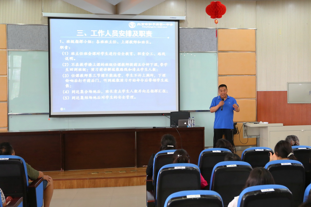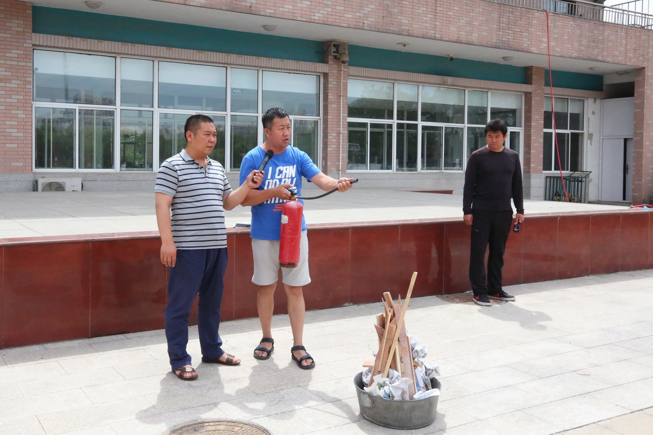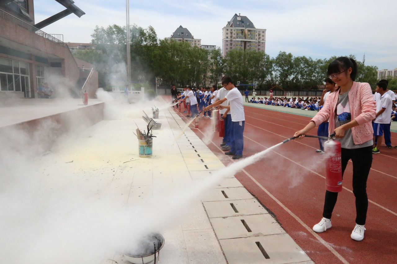 6月6日,朝阳区消防中心的老师用幽默的语言、真实的案例为全体教职工上了一堂“消防安全”课,让老师们居安思危,提高警惕性,学习一些灾难自救的方法。6月7日,全体师生进行了一场安全疏散演习。为了做好本次疏散演习,学生发展处张东辉主任在全体会上讲解疏散路线、疏散要求以及人员安排,班主任老师对学生进行安全宣传。整个演习活动有序、紧凑、安全、高效,从下达命令演练开始到最后一名教师疏散到安全集中点,时间仅用了两分零五秒。奥利匹克公园消防中队的王中队长亲自带领消防战士为全体师生展示了一场灭火演练。6月8日,朱浩主任给全体师生培训灭火器材的使用方法,部分师生代表现场体验了一把使用灭火器进行灭火。