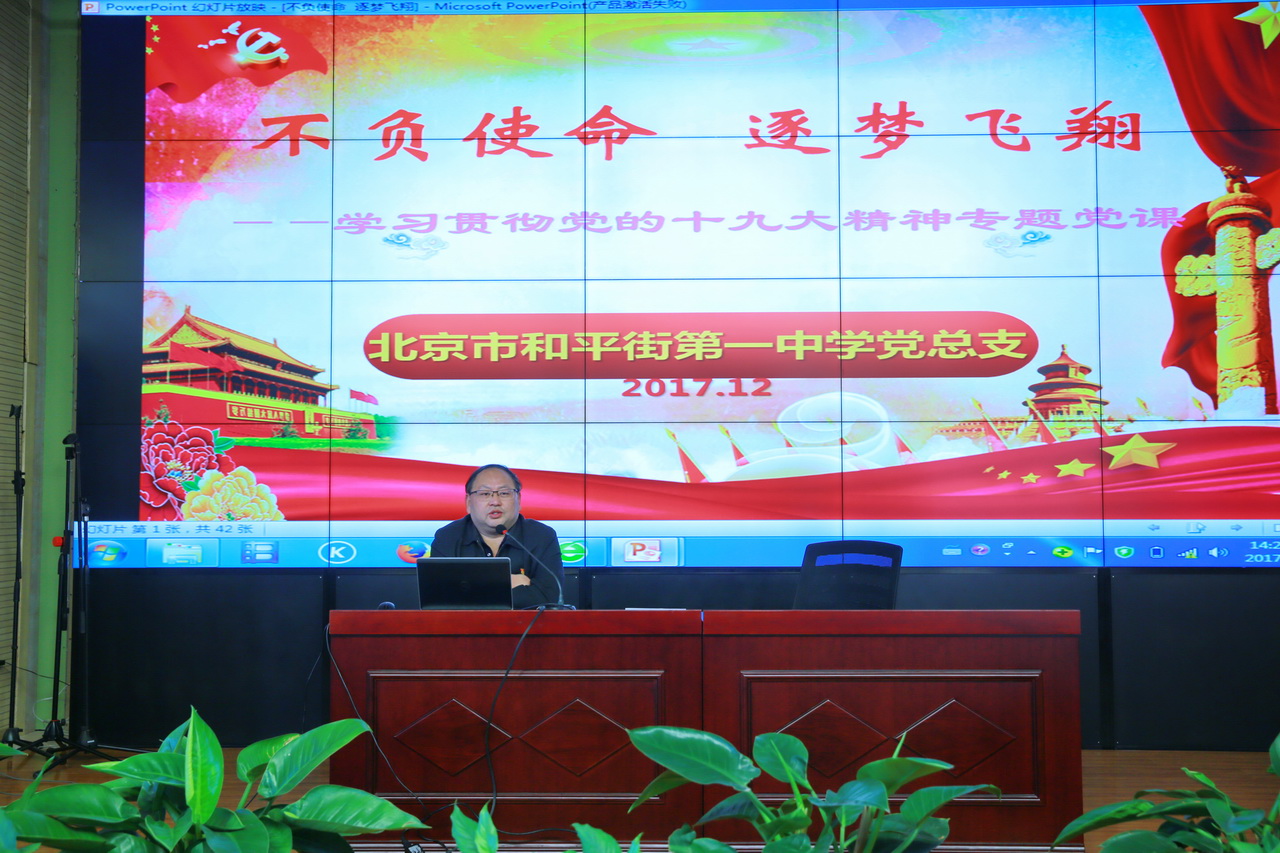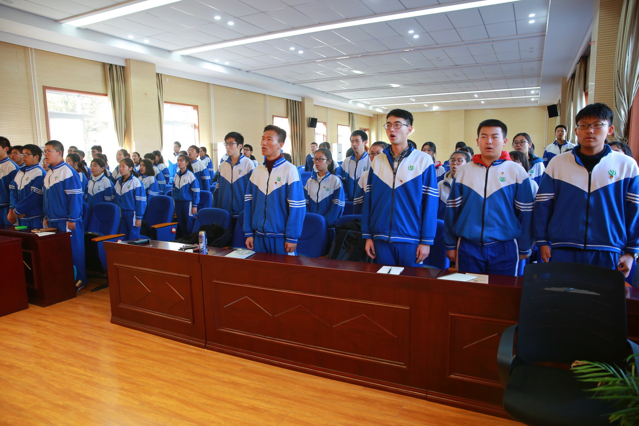 典礼结束后,党总支书记曹高仁为全体学员做了主题为“不负使命,逐梦飞翔”的学习贯彻党的十九大精神专题党课。曹高仁书记结合十九大精神对同学们提出了“学习、思考、感悟、践行”的要求;通过回顾一二九运动、12.13国家公祭日、西安事变等重要历史事件,提升学生的爱国主义情怀,教育学生不忘历史、砥砺前行;并鼓励广大团员青年争做新时代的“三有”青年,努力践行社会主义核心价值观,以最好的精神面貌活在当下,以实际行动贯彻落实好党的十九大精神,不忘初心跟党走,不断谱写无愧于人生、无愧于时代的青春乐章。