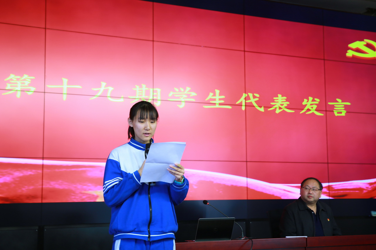 典礼在庄严的高唱国歌仪式中拉开帷幕,高一1班杨子欣作为第十九期党校学生代表进行了发言,她首先感谢学校能给全体学员这次成长和学习的机会,并代表全体学员向党组织郑重宣誓:认真上好每一堂党课,在今后的学习和生活中严格要求自己,争取早日加入中国共产党。