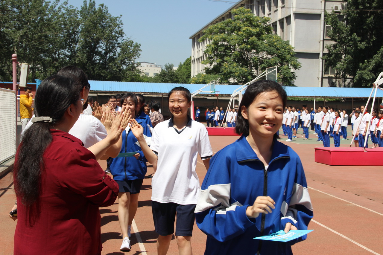 升旗仪式结束后,四位高二年级学生代表为高三学长们深情朗诵诗歌,送上诚挚祝福。高三年级组长梅晓璇老师、李伟老师分别发表了热情洋溢的讲话,回顾了高三学子在校三年的点点滴滴;叮嘱高三学子准确定位,调整心态,控制节奏,充分思考,清清楚楚,胜券在握;并鼓励同学们勇往直前,决胜高考。和平街初中校区教学处主任李春光代表校区师生为高三学生送上祝福,李主任表达了对学生充满期待、兴奋和不舍的心情,鼓励学生淡定、自信、从容的面对高考,用自己的胆识、勇气、实力和智慧去创造属于自己的辉煌!最后,校长、书记还有全体高三年级组的老师们与同学们击掌鼓劲,为每一个孩子送上精心准备的“和一福袋”,里面装着由校领导亲自包装的“状元饼”、成人仪式光盘、高考备忘录和送给学生的一封信。活动在热烈的掌声中落下帷幕。