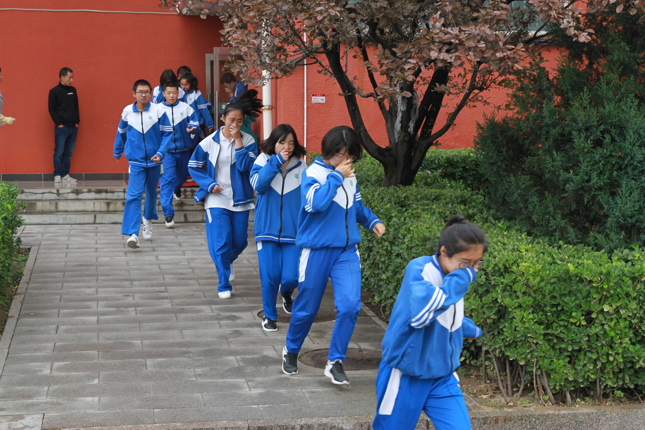 随着警报声的响起,校区全体教师和学生,迅速作出反应,在各班主任及其他安全疏散引导员的带领下,弯下腰捂住口鼻,排成一路纵队一个跟着一个,按照紧急疏散路线,从教学楼各教室安全、有序撤离到学校大操场,用时2分10秒。