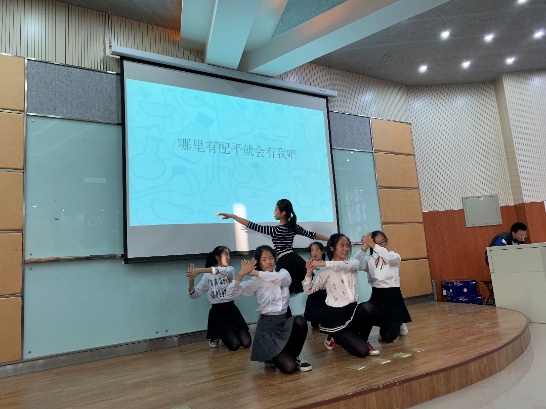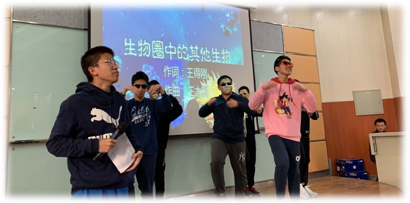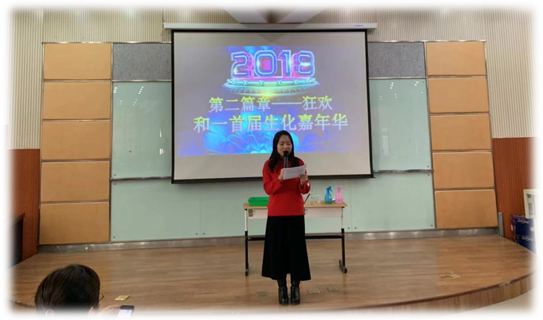第二篇章主要是向学生展示生化学科生动、有趣、诙谐、幽默、优雅的另一面,让学生在欢乐的氛围中感悟生化、爱上生化。狂欢活动由各年级生化教师分工完成,生化组李茜老师担任活动主持人。