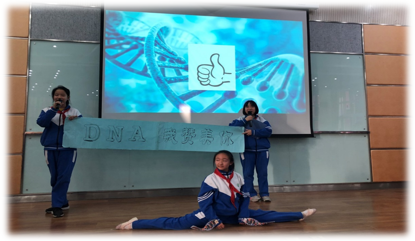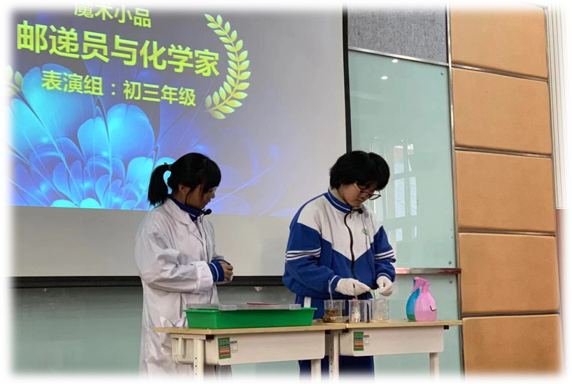 狂欢活动中,初一到初三年级共奉上了6个精彩的节目。初三徐谢昱灿、韩晶晶、李嘉雯三位同学带来的魔术小品《邮递员与化学家》,演绎了一个一心只想发大财的邮递员与化学家之间的精彩故事,小品中几个简单而又不失精彩的化学小实验博得了同学们的阵阵笑声和掌声;初一张日唐、付正飞同学带来的健康宣讲《远离癌症》用精炼的科学语言讲述了癌症引发的原因及预防癌症的方法,让全体师生受益颇多;初三男生团体李林溪、邱嘉俊等同学带来的生物歌舞《生物圈中的其他生物》将整场嘉年华的气氛推向了高潮;初一年级钟佳妮、张程程等同学带来的诗意节目《DNA赞美诗》让同学们深深感受到了生物之美;初三女生刘逸菲、陈涵等七位同学带来的舞蹈《化学之韵》将美丽的现代舞蹈与芭蕾的结合,配上改编化学歌词的柔美音乐背景,让人陶醉其中又耳目一新;初二年级周宣博、宋子奥等八位同学带来的宣讲《多莉的诞生》用简单诙谐的语言描述了首只克隆羊多莉的诞生,让大家收获满满。