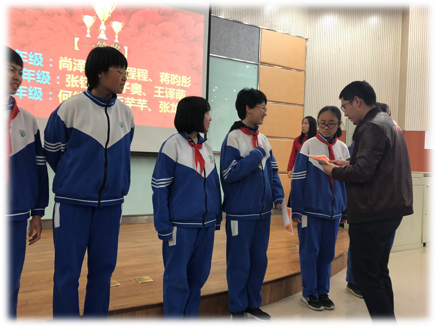狂欢活动的最后,全体观众对六个节目进行投票评选,再次回归到活动的主题:寻找你心中最美的那个“她”。最终,初三男生节目《生物圈中的其他生物》以压倒性优势成为大家心中的最美。在大家的热情要求下,此节目再次返场,将活动又一次推向高潮。最后,教务处邓立主任及全体生化教师为第一篇章及第二篇章活动中获奖的学生颁发了奖状及奖品,鼓励他们再接再厉,将来在生化领域有所建树。
