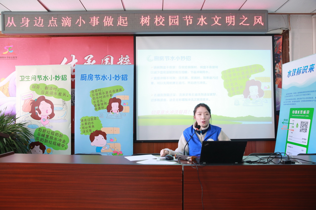 讲座中,节水公益志愿者为同学们讲解了地球水资源的情况及北京的用水情况,同时还教授大家在学校、家庭、公共场所如何节约用水。同学们与志愿者积极互动,分享自己的节水小妙招,并记下了今后该如何做一名节水小能手。