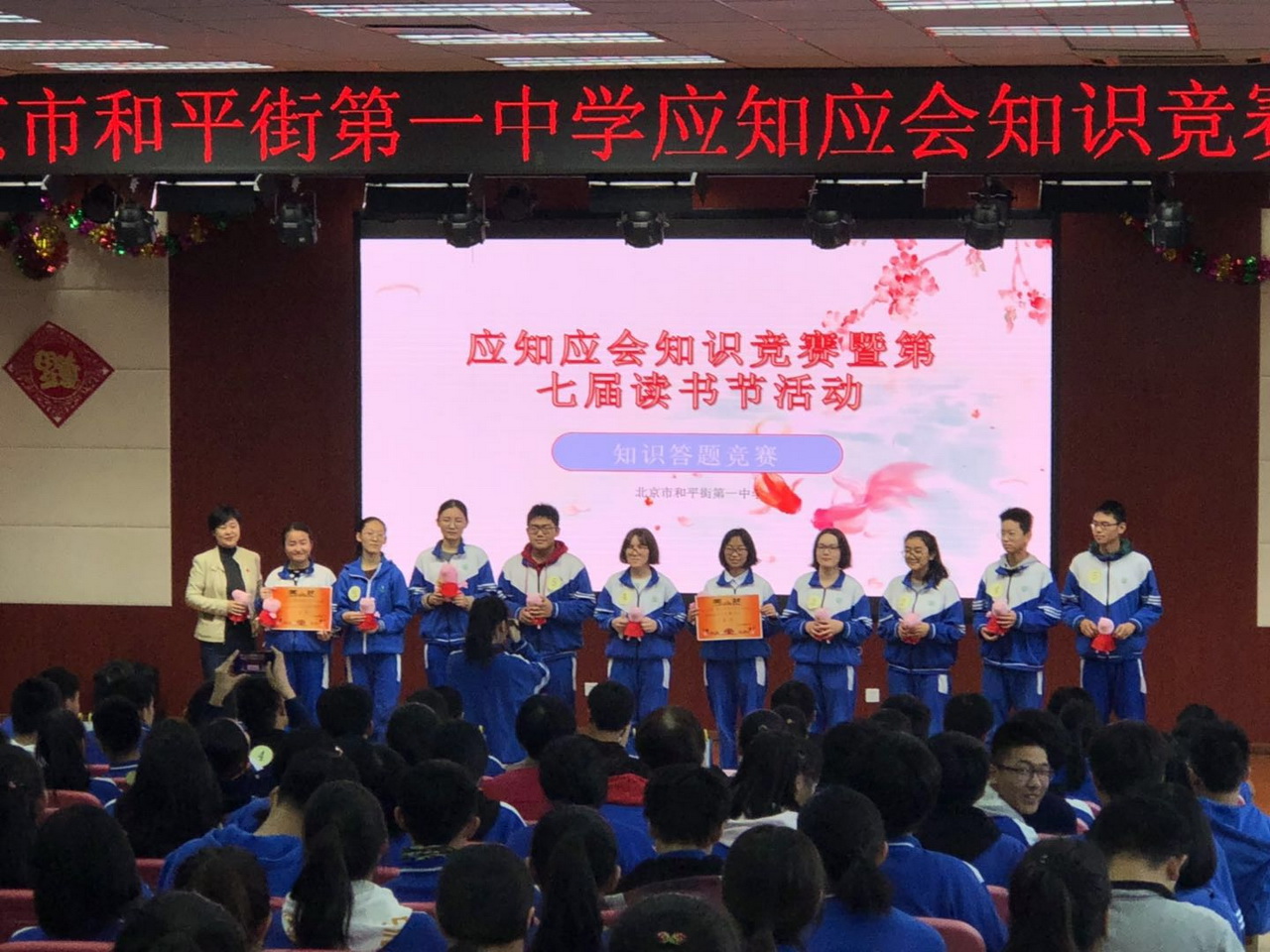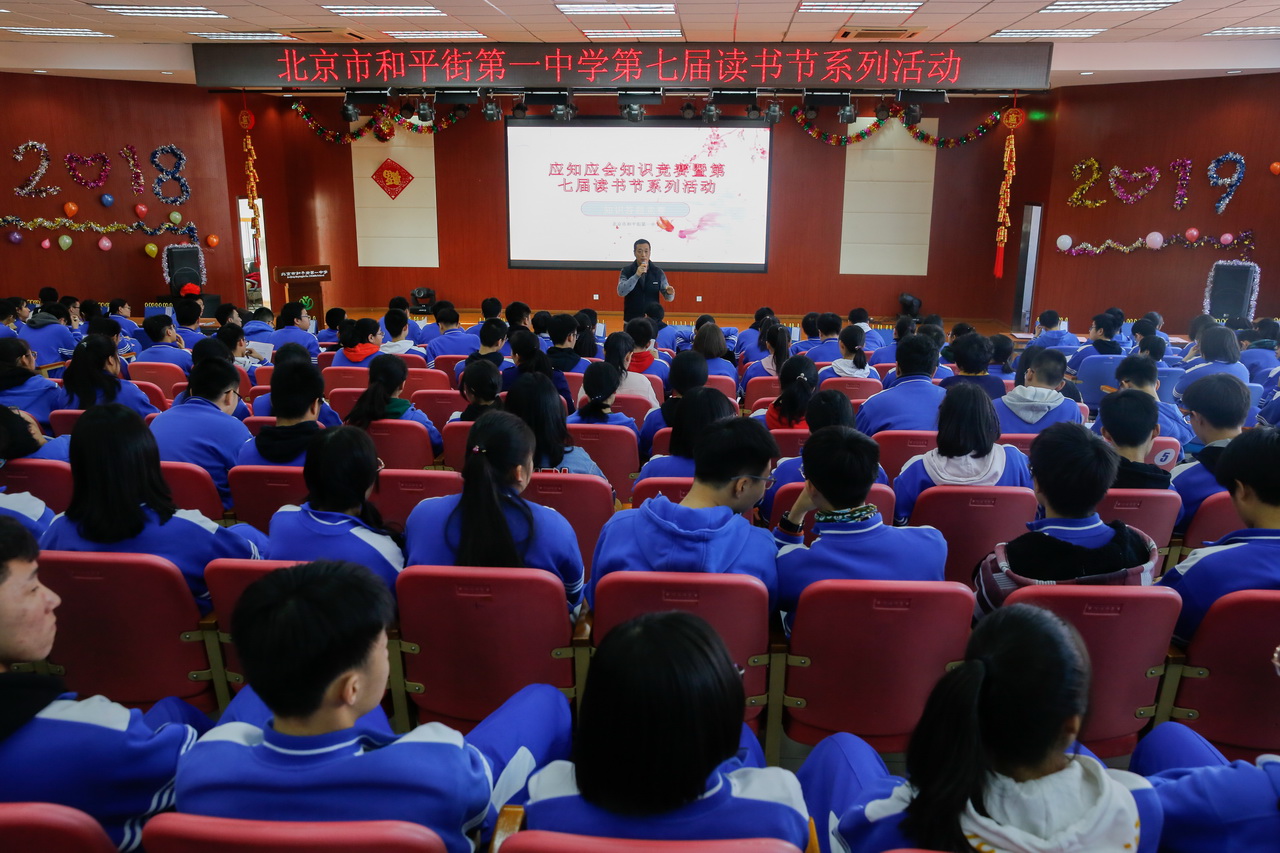 为了激发学生的阅读兴趣,拓宽学生的知识视野,培养学生阅读和积累知识的好习惯,丰富校园文化生活,营造“爱读书、读好书”的校园文化氛围,让学生更好理解、掌握“应知应会”知识内容,2019年1月23日,和平街一中莲葩园校区举办了第七届读书节系列活动——应知应会知识竞赛活动。周建萍副校长,刘鹏校长助理,学生发展处王军主任、洪娟主任,非毕业年级组长、班主任出席并观看了比赛。王军主任、孟昭莉老师、郝雏凤老师应邀担任本次比赛的专家组成员。