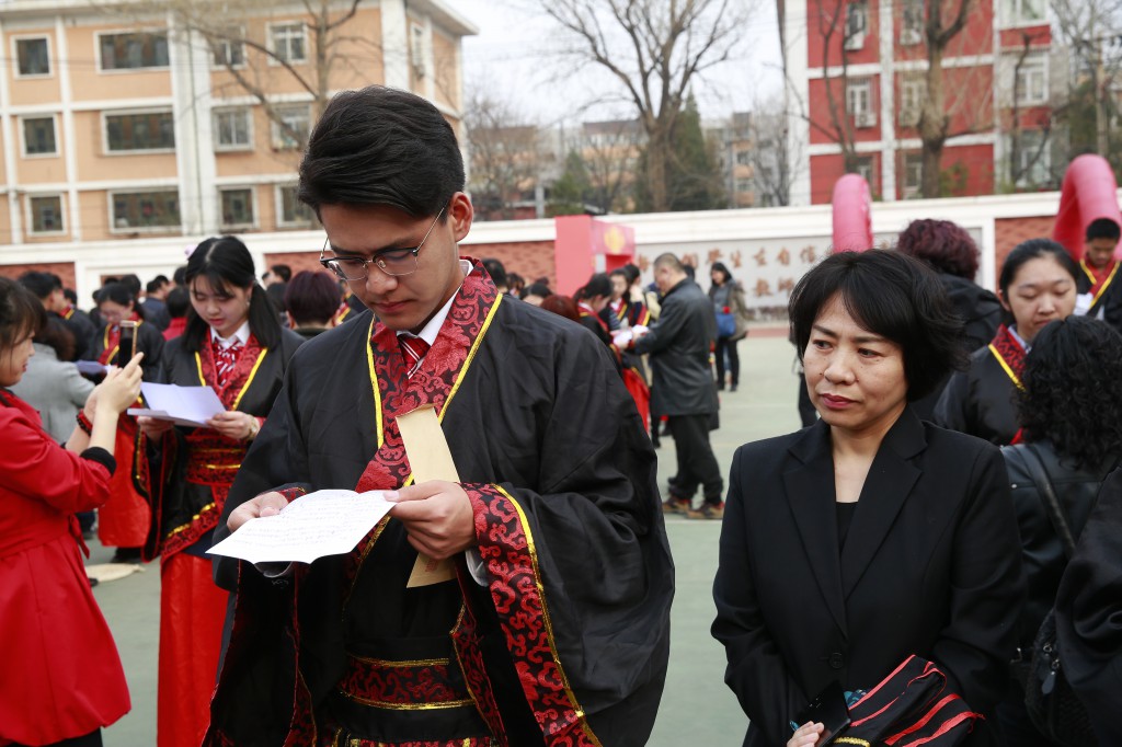 和一校园恬静美好,惬意舒适。200多名高三学子身着汉服齐聚操场,彰显出和一学子自信阳光的精神面貌。在老师、家长、学校领导的共同见证下,全体学生迈过象征着成人的成人门。“成”即“成人”“成才”之意,跨过大成门,意味着从孩子到成人的转变,意味着从此走向更广阔的天地。