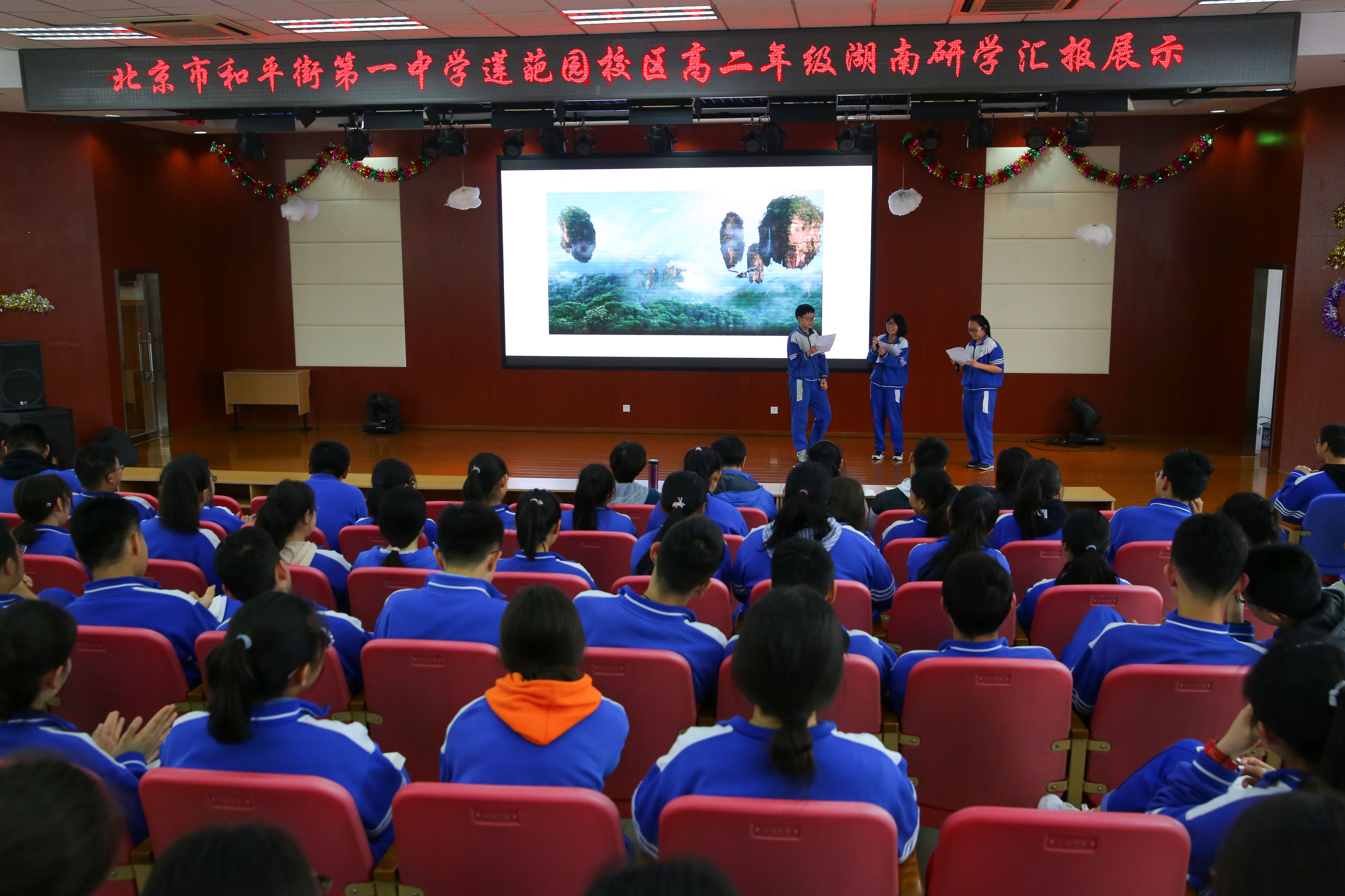在刚刚结束为期5天的“研学伟人故里 探究湖湘文化”社会实践活动后,2019年4月9日,北京市和平街第一中学莲葩园校区举办了一场高二年级湖南研学活动的小组汇报展示会。