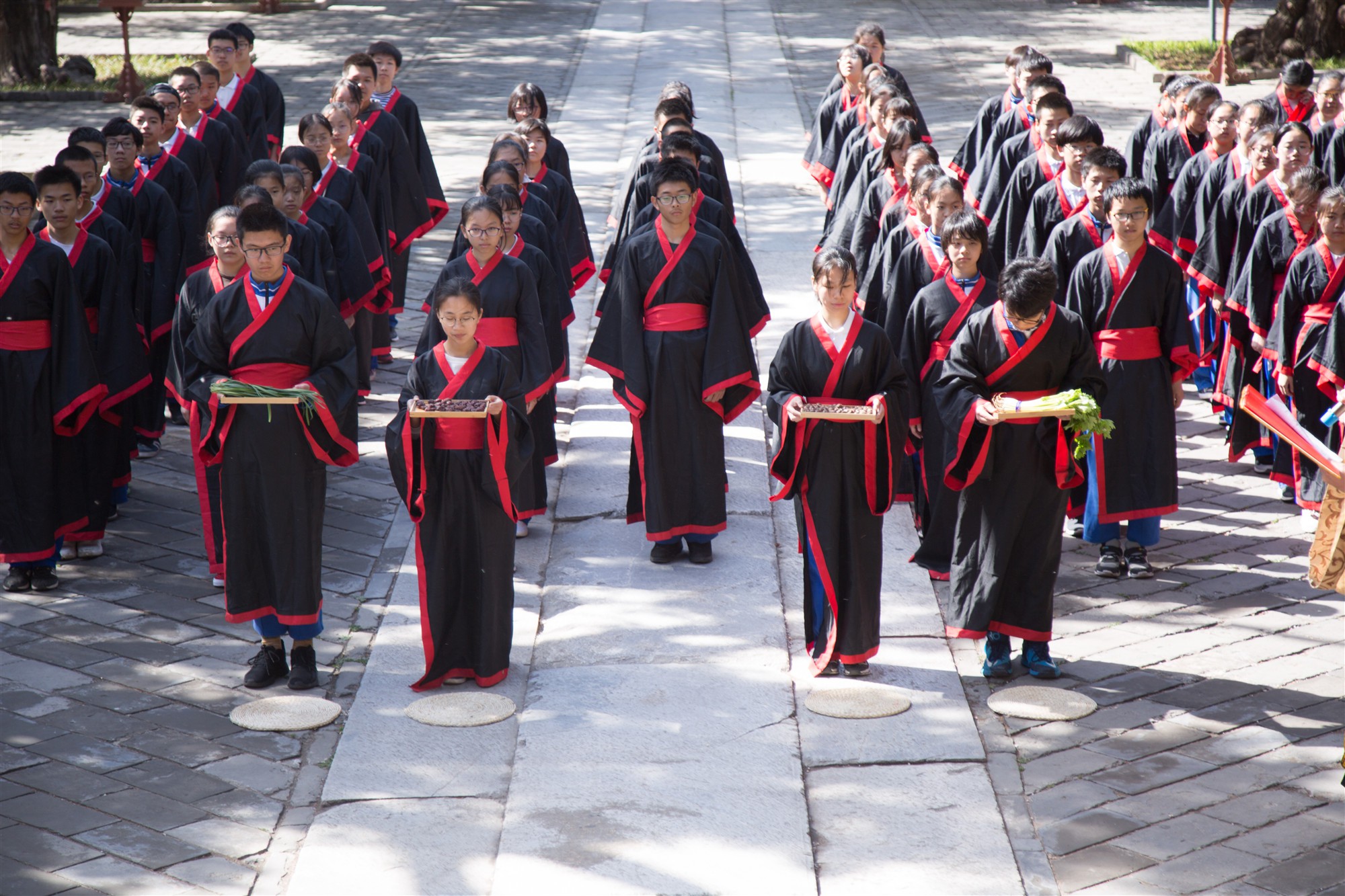 转过孔子的雕像,跨过大成门,我们来到了大成殿前。第一件事便是举行释菜礼,释菜礼便是表达我们对先师的敬意的仪式。伴随着庄重的音乐声,四名释官托起祭礼——代表着勤于学的芹菜、早立志的大枣和栗子还有多才华的韭菜,款款走向大成殿,将祭礼放在了大成殿前的蒲团上。接下来同学们在司仪的指导下行了四拜礼,“拂手——高揖——拜——兴——”以示对至圣先师孔子的敬仰,亦是表达学子对老师们的尊重。