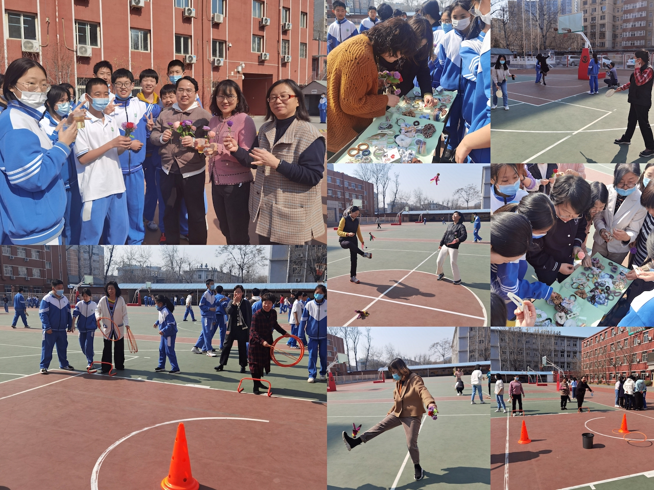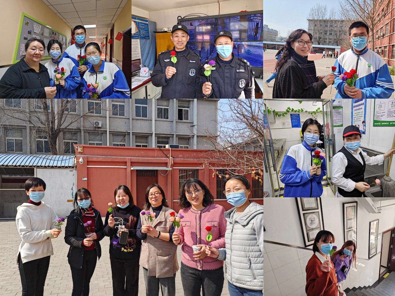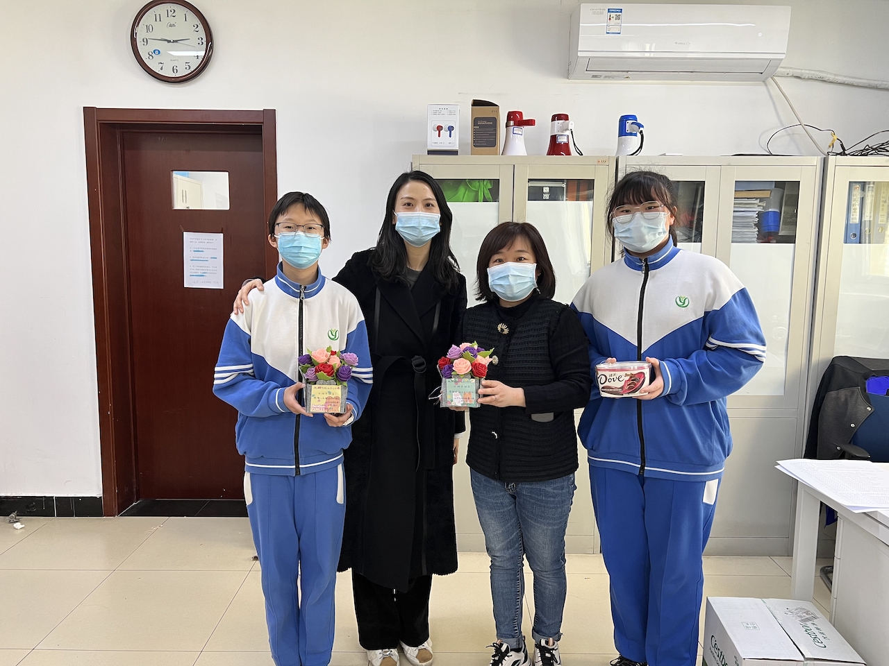 3月8日上午课间操,全校学生在操场上送上“成语串烧”的花式祝福,为女性教职员工带来欢乐与感动。中午,初一初二学生会同学精心组织了午间游艺活动以及“品茶会”,并为全校的教职员工送上一朵小花,带去节日的祝福,整个活动充满了欢声笑语。下午,我们组织各班代表,前往和平东街社区以及光熙门地铁站,为女性工作人员,送上节日的祝福。同时,我们还为守护我们平安的武警战士送上了学生的亲笔信《致敬最可爱的人》以及手工花篮,表达了全校区学生对武警战士的感谢。