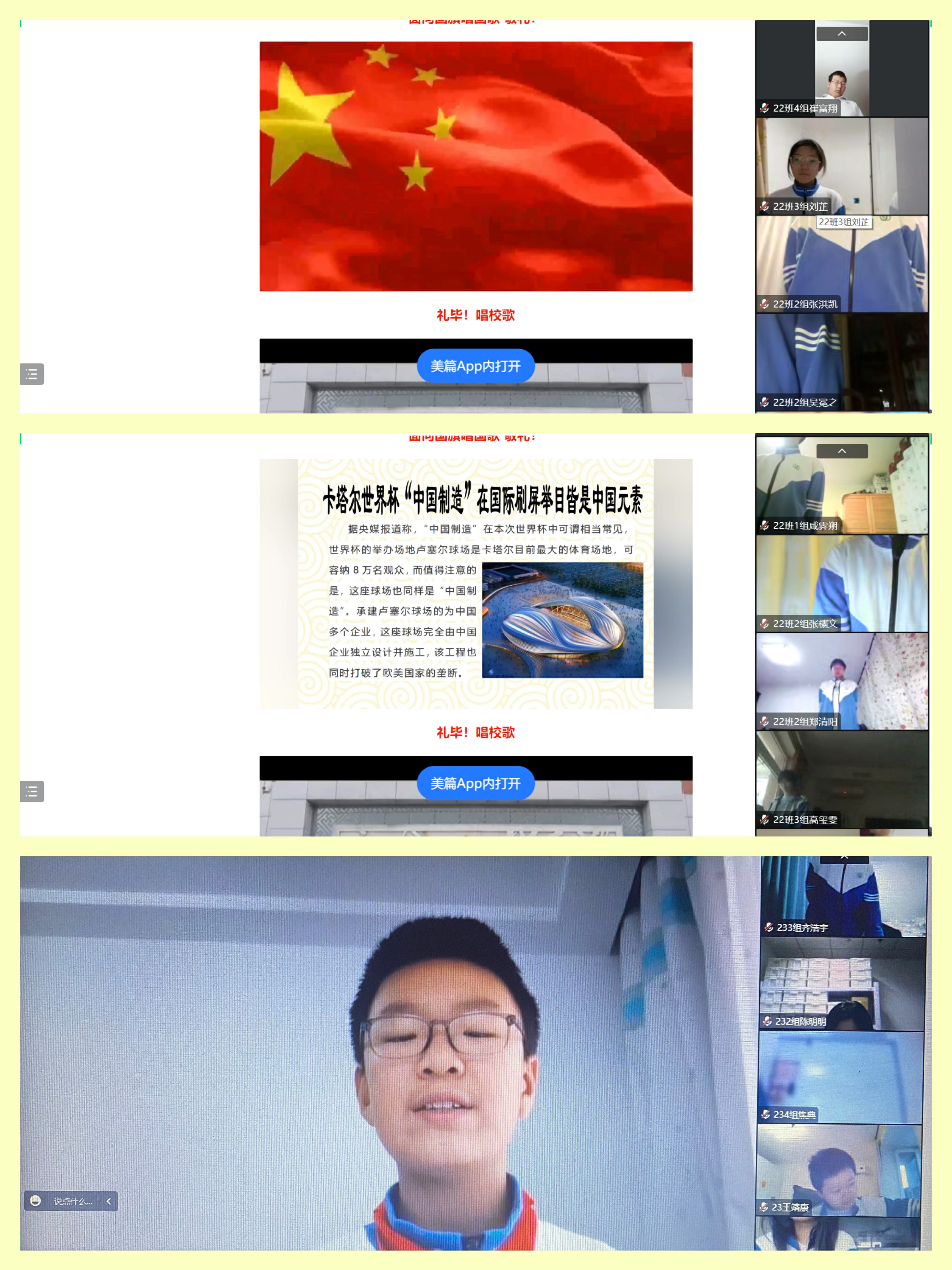 师生云端相聚,唱国歌、校歌,听学生国旗下讲话和家长代表寄语、看优秀学生表彰。学生从鲜艳的国旗中感受中国力量,在激昂的国歌中唱响民族强音,从声声寄语中汲取力量,在先进表彰中坚定梦想。