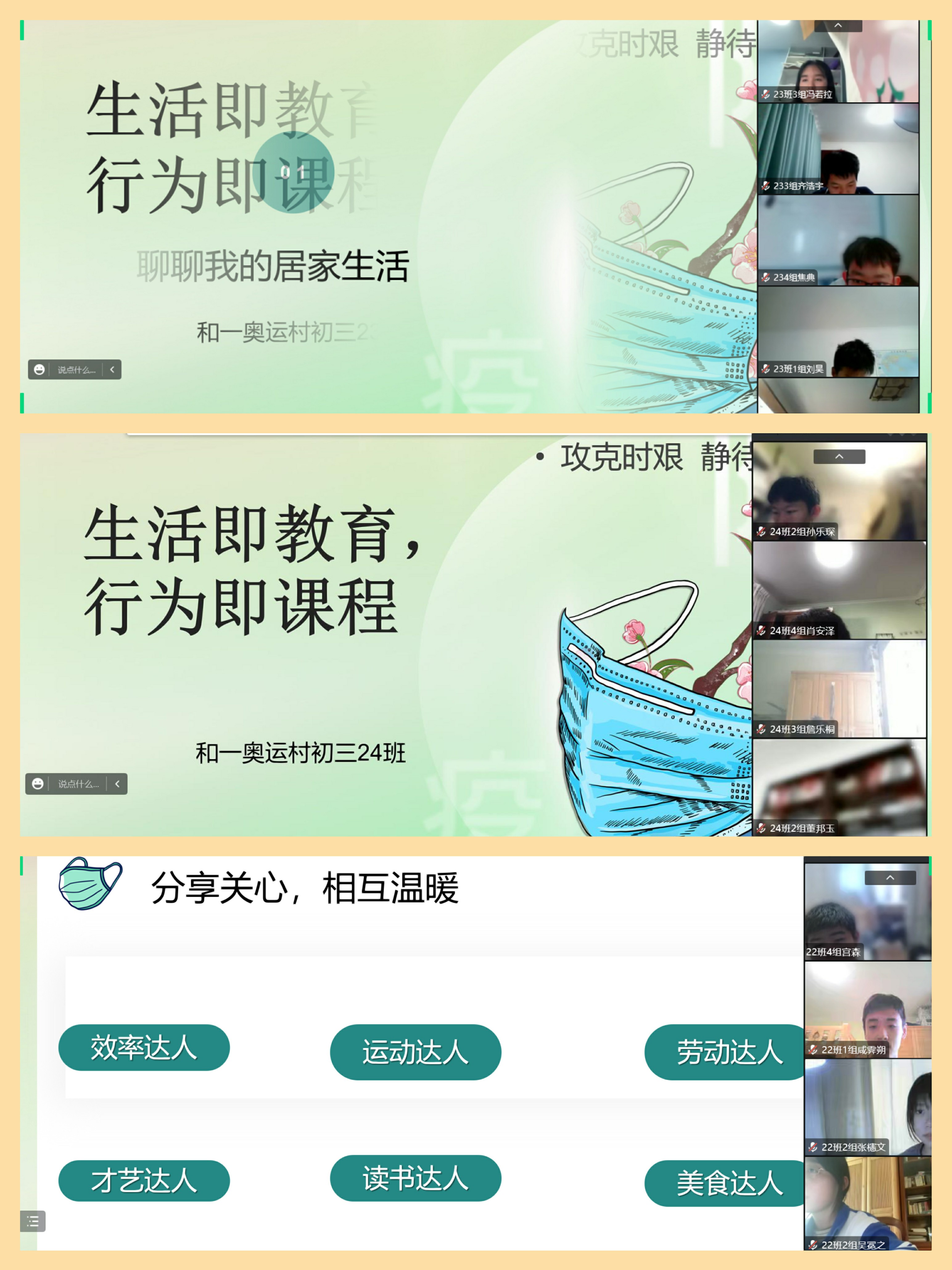 各班推选出班级“效率达人”、“才艺达人”、“运动达人”、“读书达人”、“劳动达人”学生做分享,通过分享缓解学生心理压力,同时树立学生榜样,引导学生科学合理的度过一个身心健康、充实、有意义的居家学习生活。