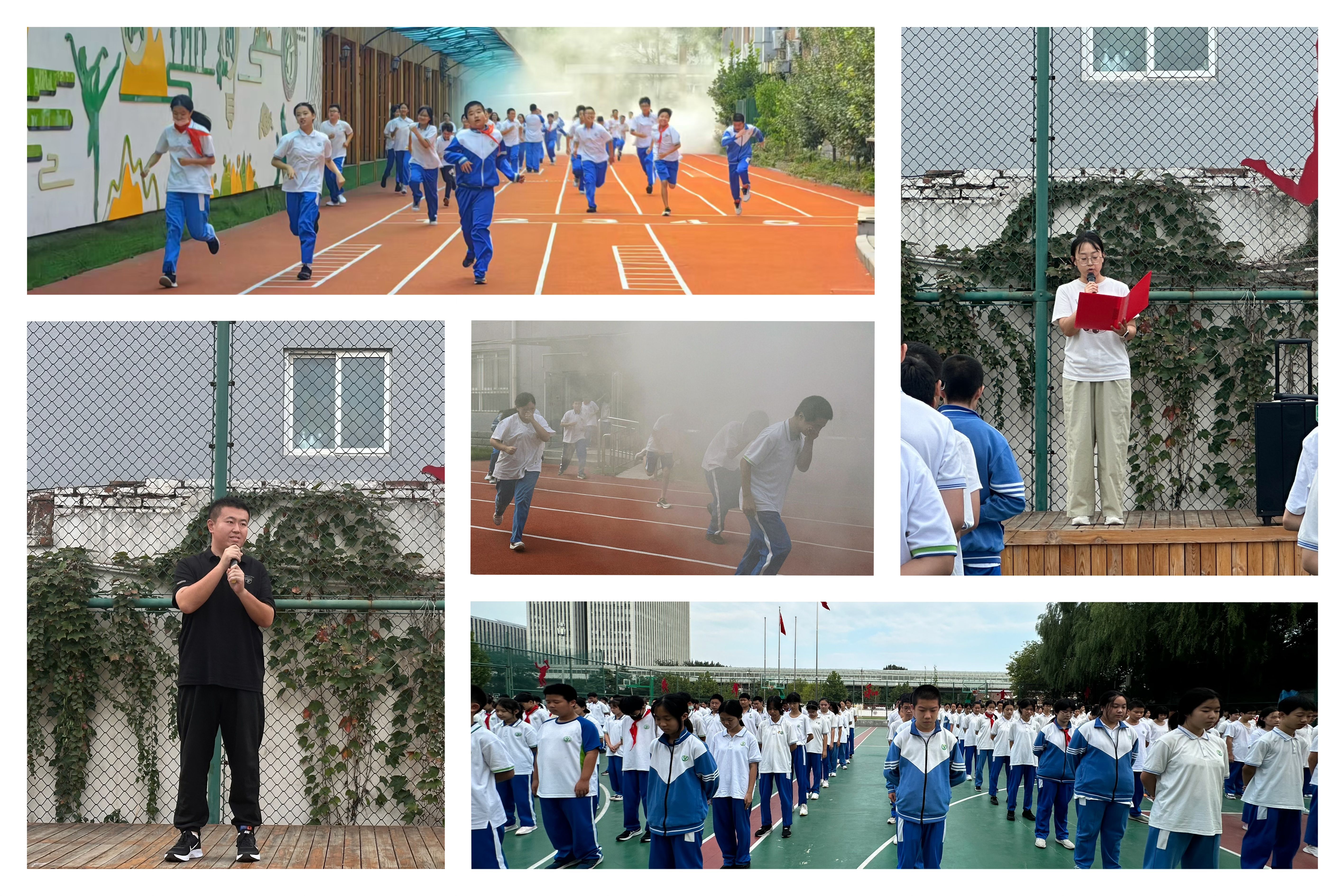 随着急促的警报声划破校园的宁静,教学楼门口模拟的烟雾缭绕,仿佛将人们带回了那个战火纷飞的年代。全体师生闻声而动,立刻进入了高度戒备状态,他们沿着既定的路线,迅速而有序地从教学楼撤离至操场。周烨老师从历史学科角度对同学们进行了生动的爱国主义教育。学生发展处主任刘争对本次活动进行了总结。