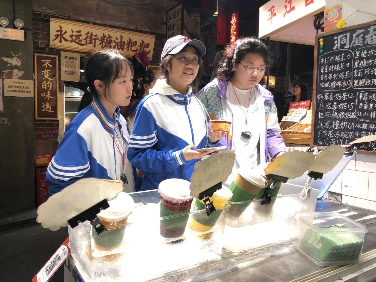 在这里,同学们仿佛穿越回了上世纪的长沙老街。青砖黛瓦、绿皮火车、供销社柜台……每一个场景都充满了怀旧气息。大家在复古街区中打卡拍照,品尝地道的长沙美食,如糖油粑粑、臭豆腐、大香肠等特色小吃,令人回味无穷。