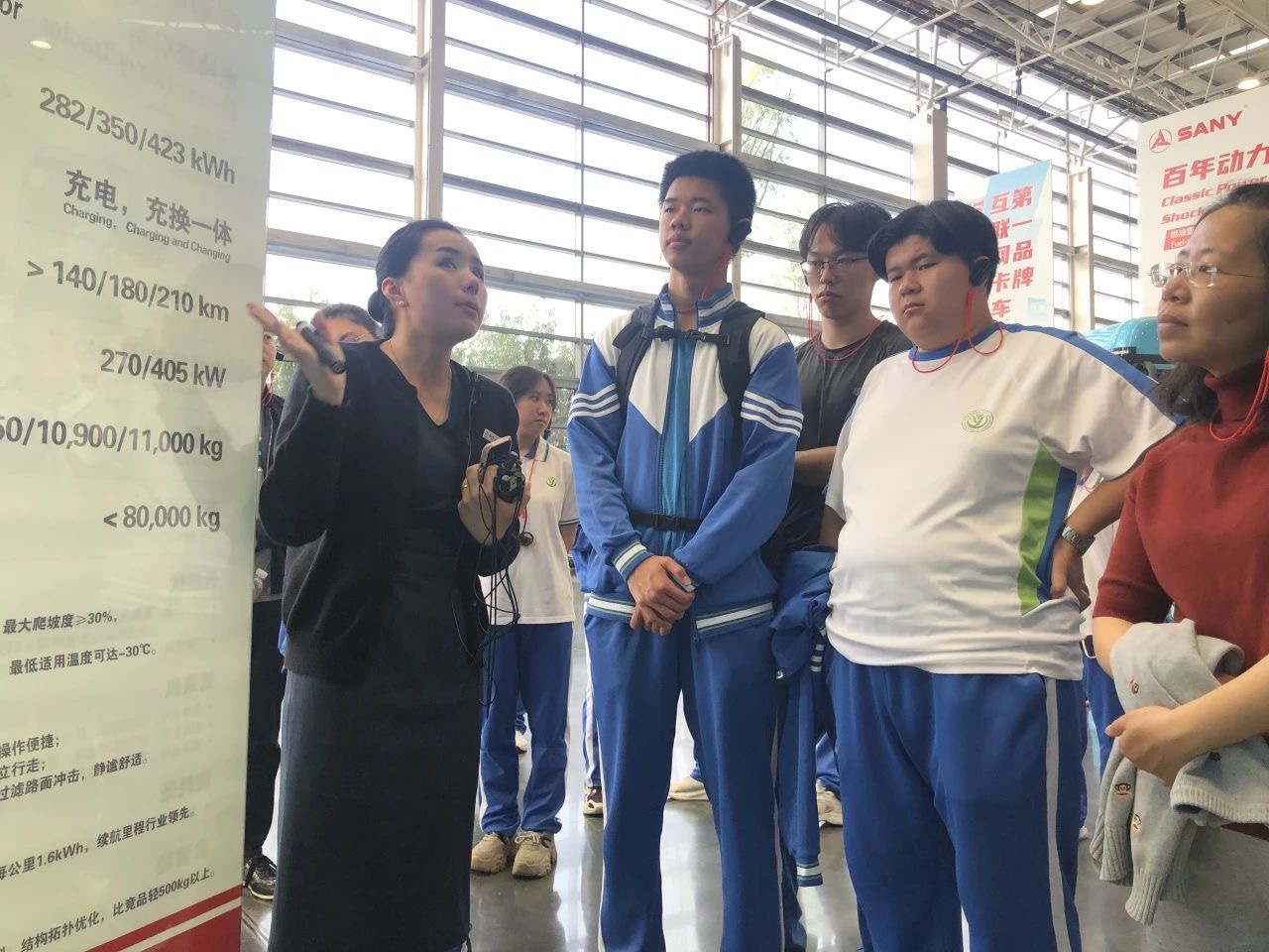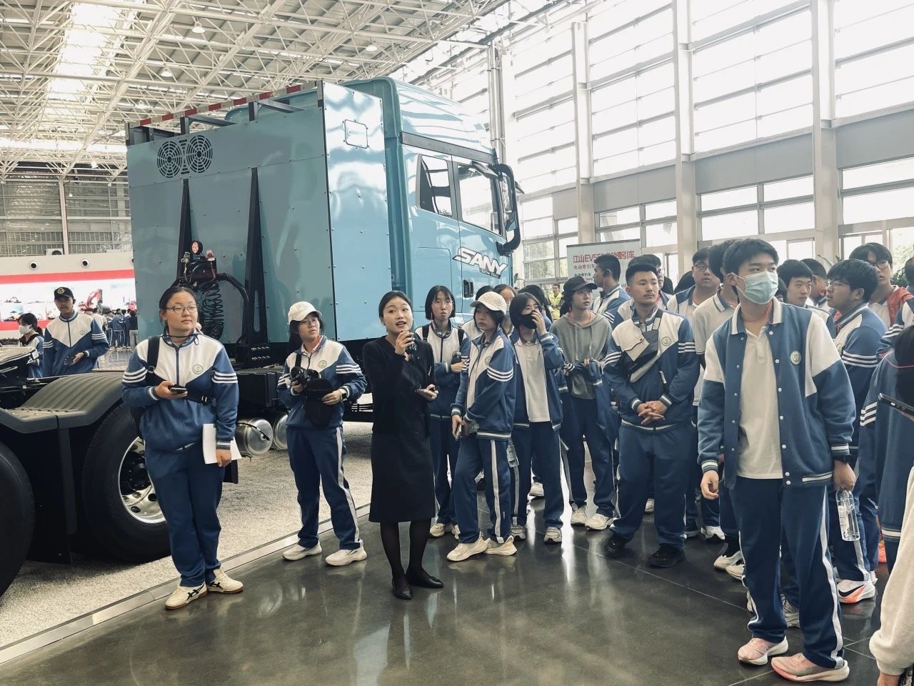 首先,同学们走进三一重卡的企业展厅,深入了解三一从湘江畔的乡镇企业成长为全球重工巨头的创业历程。展厅内,一件件展品和生动的讲解,展现了三一“让世界爱上中国造”的奋斗精神,让同学们深刻感受到中国制造的崛起之路。