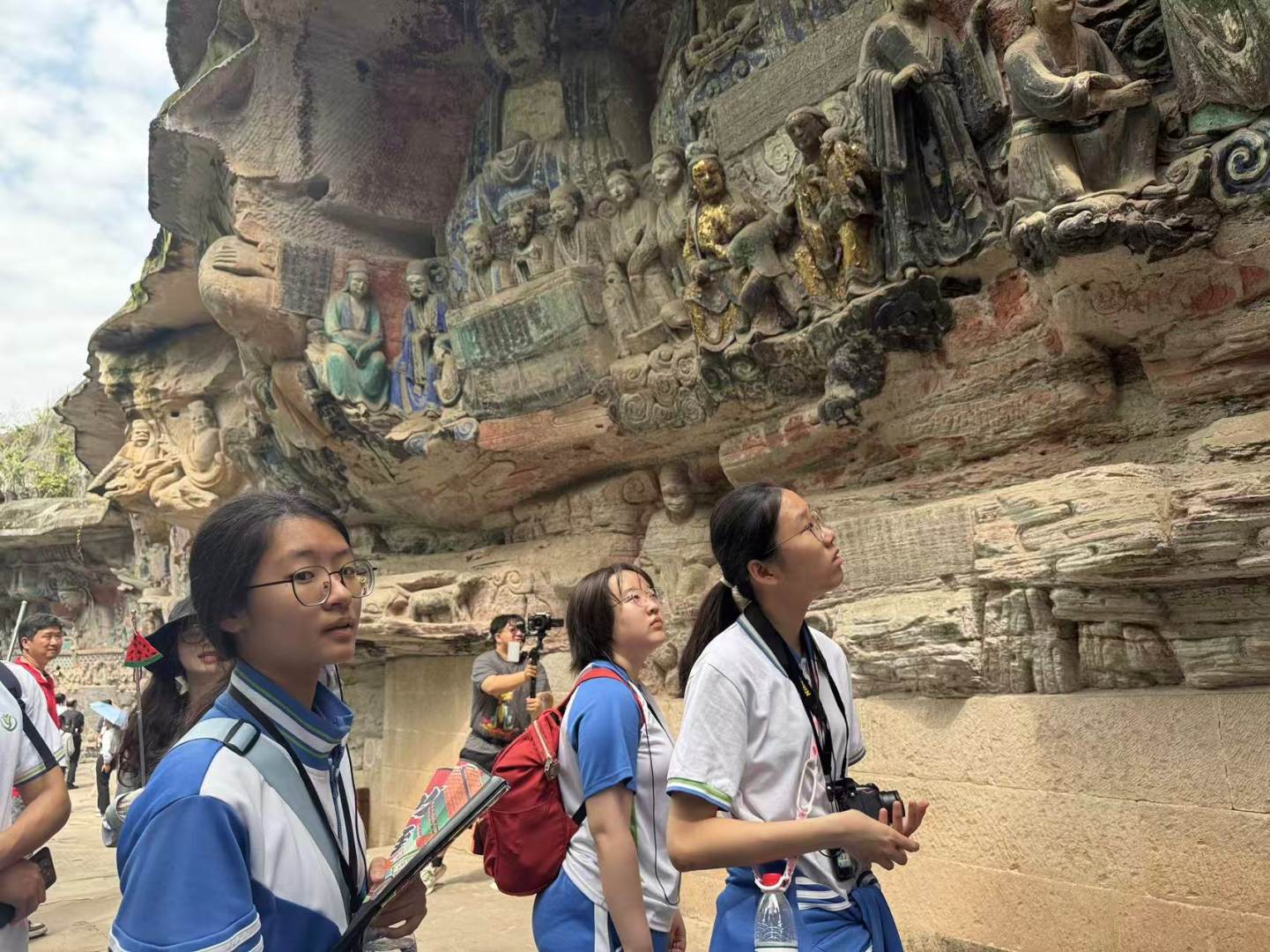 第四天,同学们前往世界文化遗产——大足石刻。在宝顶山,规模宏大的石窟造像群令人目不暇接,从慈悲庄严的佛像到展现世俗生活的“牧牛图”,工匠们以精湛技艺,将“儒释道”三教融合的哲学思想与世俗生活完美结合。