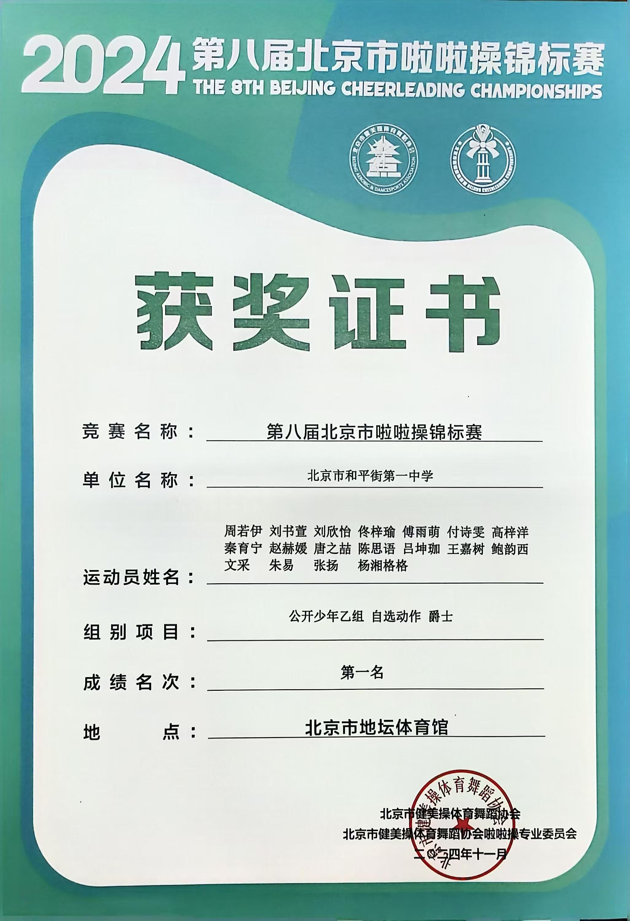2024年11月24日,和平街初中校区爵士啦啦操社团参加2024年第八届北京市啦啦操锦标赛并荣获公开少年乙组爵士自选组别冠军。