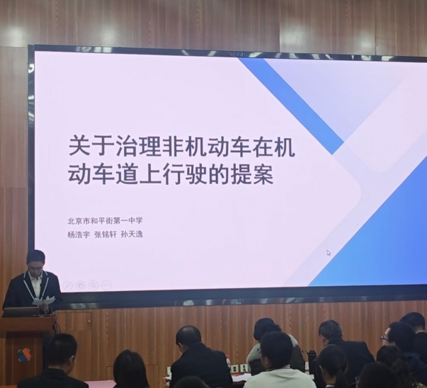 2025年1229日,北京市十一届青少年模拟政协提案交流展示活动在八十中举办北京市和平街第一中学高二3班孙天逸代表团队参加活动分享交流了《关于治理非机动车在机动车道行驶问题的提案》。该提案聚焦城市交通治理中的现实痛点,以精准的问题定位、扎实的调研基础和可行的解决方案,彰显了和一学子对社会问题的敏锐洞察与责任担当。