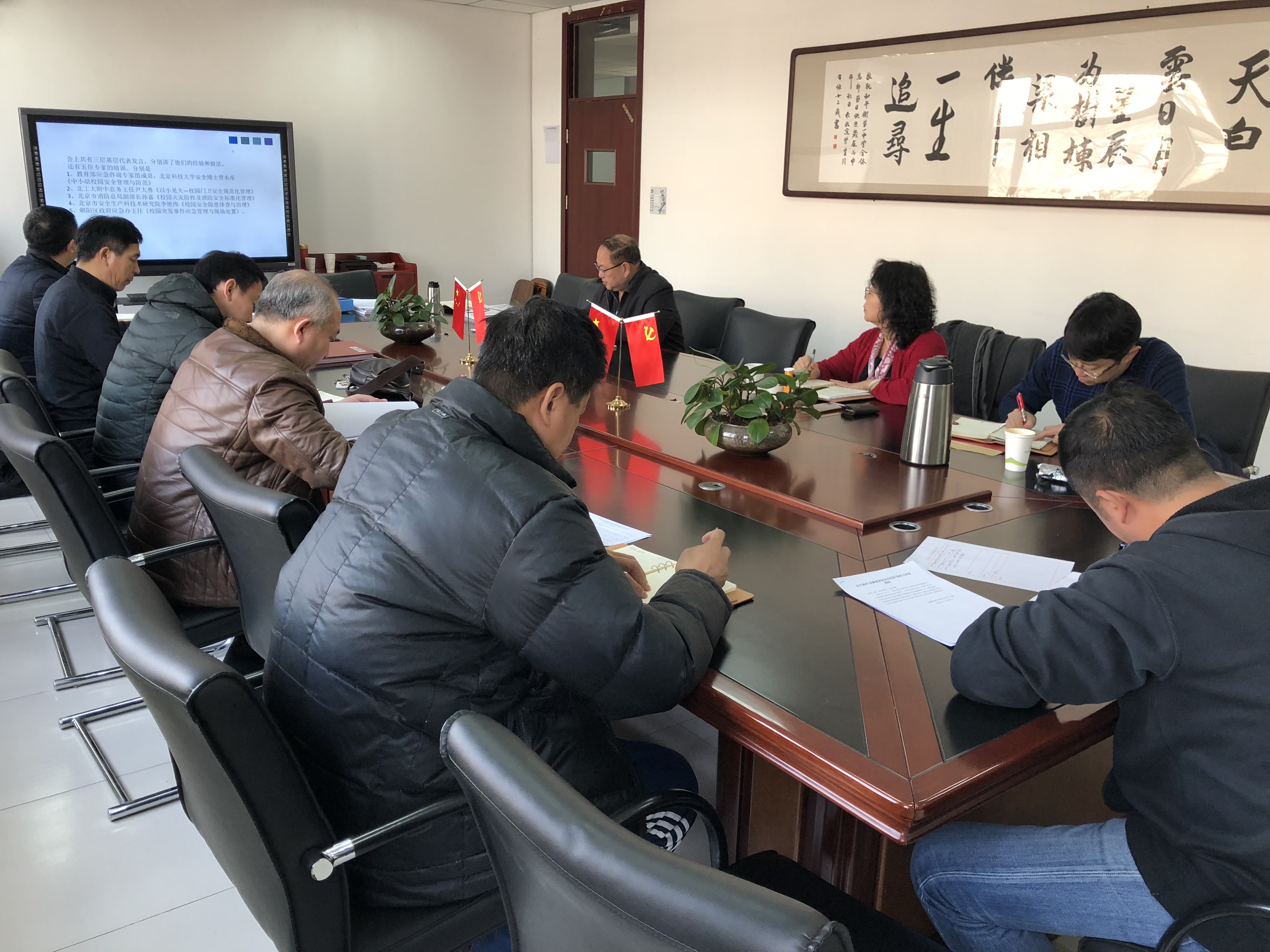 会上,校长助理刘鹏向与会者传达了朝阳区教育两委2018年安全工作会议相关精神。校长办公室主任张习文对总务安全工作进行了部署,即加强消防安全工作,加大校园校舍安全排查力度,加强保安培训、门卫安全教育,明确节假日值班人员职责,做好春季卫生防疫、食品卫生安全等工作;并提出了当前校园安全工作的几个问题,希望引起各部门的重视。总务主任王宏君对学校近期具体工作进行了安排,提出了具体要求。陈秀珍校长进行了讲话,要求大家认真学习区教育两委安全工作会议精神,查找工作中的不足,不断改进完善自身工作;强调安全工作不能赌,各部门要相互配合、团结协作,各校区要加强安全隐患排查,发现问题,及时整改;并对值班、传染病防控、食堂管理、卫生工作、库房工作等具体工作提出了具体要求。最后,曹高仁书记进行了总结,希望大家严格落实学校“五项制度、四个巡查”工作要求,严格落实两会安全责任,确保校园安全及两会期间形势稳定。