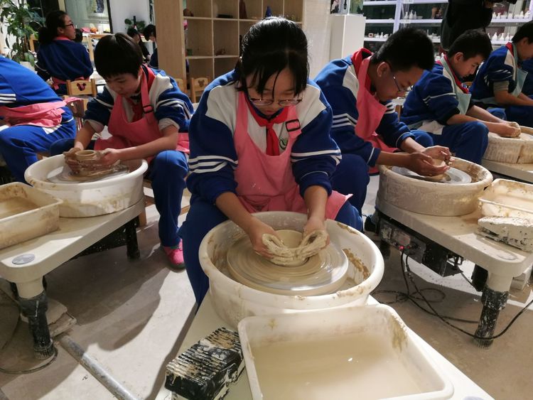 “给大家印象最深刻的莫过于拉坯。讲解员向同学们做了示范,先将一块泥团置于制坯机的中央,然后开启制坯机,随着制坯机的高速旋转,陶土在老师灵巧的手中,像魔术一样变出一个个可爱的造型,杯子、小碟、花瓶……我们看得眼花缭乱,心里已经抑制不住地跃跃欲试了。等到讲解员一声令下,我们迫不及待地‘动工’了。‘速度不要太快!’指导老师提醒。不过有些晚了,有的同学太急于求成了,结果泥团飞进了缝隙里卡住了;有的同学蘸水塑形时不小心将泥水溅了自己一身,狼狈地就像同泥巴打了一架;有的同学虽然塑成了形,却东倒西歪不成样子,与老师的‘模范作品’一比,简直惨不忍睹……尽管‘事故’层出不穷,最终我们都做出了自己的作品,心里满满的快乐和收获感。”