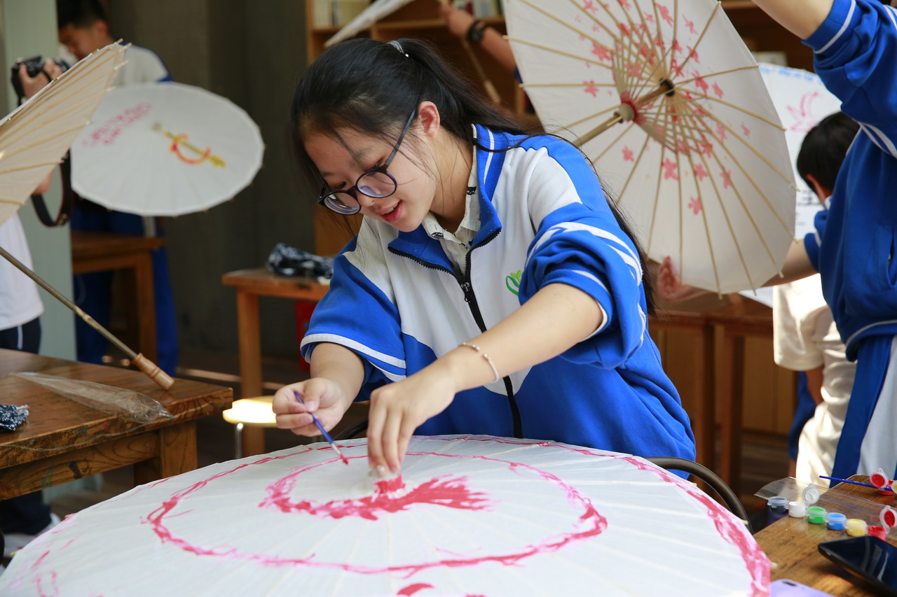师生们行走在西湖边,欣赏着优美的江南胜景,领略着西湖纵连古今沧海桑田的变化和改革开放新时代的新面貌;在岳王庙聆听民族英雄岳飞的故事,感受精忠报国的民族精神,心中崇敬之情油然而生;徜徉在水草丰茂的西溪湿地,体会着江南水乡悠远的历史文化和丰饶的自然资源;在杭州中国扇博物馆体验油纸伞伞面作画,发工艺审美之意趣,感工匠精神之意蕴,呈想象之才,展个性之态。