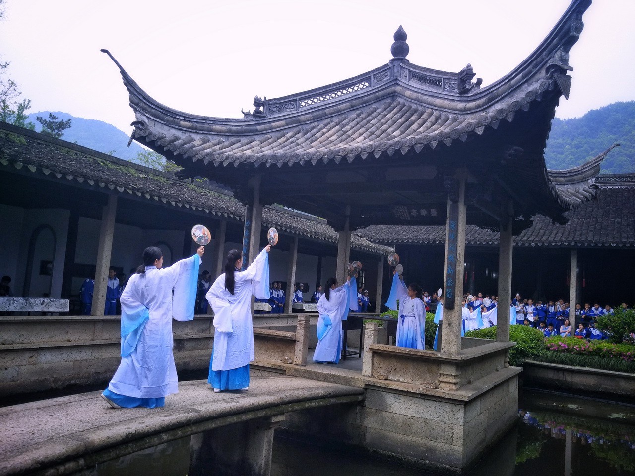 在素有“东方威尼斯”的绍兴,同学们在兰亭再现“曲水流觞”的兰亭盛宴,于茂林修竹之间集体吟诵。在王右军祠,飞檐之下,舞蹈小组的同学时而抬腕颌首,时而轻舒飘袂,手中扇起,似羲之笔走游龙,玉袖生风、翩翩起舞。在鲁镇,镇公所、鲁四老爷府邸、咸亨旅店、通济当铺、越瓷商行、古玩商铺一应俱全,还有“阿Q”、“祥林嫂”等人物行走在街头,让同学们直接融入到课本里鲁迅笔下的世界。