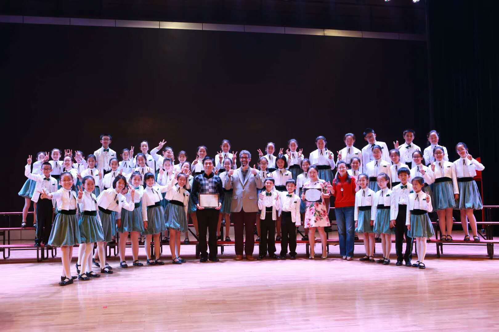 展演的最后,进行了颁奖仪式。蒋文杰副校长、张馨文老师、周伶老师代表青苗合唱团,接受了组委会及费尔南多博士授予的示范团证书及邀请函。这真是青苗合唱团一次难忘的经历!
