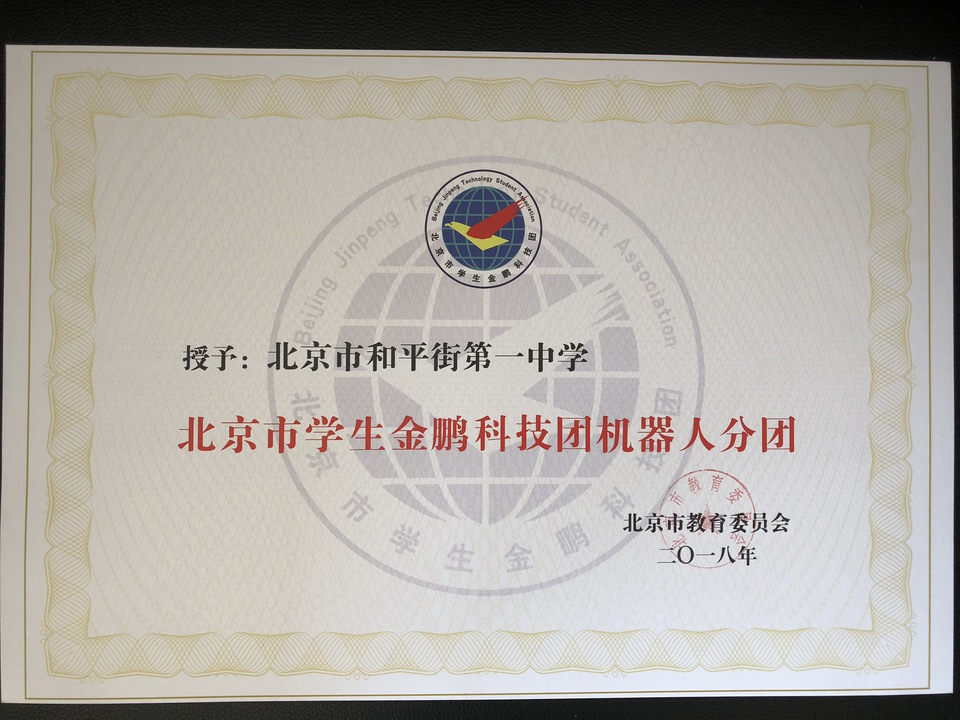 2018年5月3日上午,北京市中小学高水平学生社团命名大会在北京学生活动管理中心剧场举行。经北京市教委评审认定,北京市和平街第一中学被授予“北京市学生金鹏科技团机器人分团”称号。