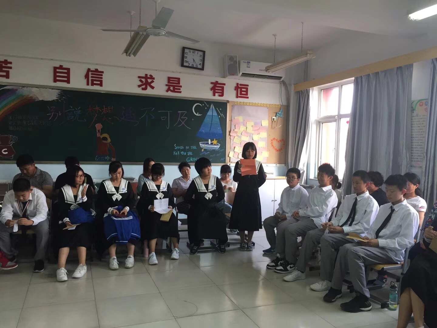 下午3:00,初二年级家长们在阶梯教室集中,聆听一场张东辉主任带来的家庭教育讲座。张主任用幽默的语言,真实的案例,告诉家长如何面对青春期的孩子,跟他们进行有效的沟通。讲座结束后,各班在本班教室举行期中的表彰活动。老师们针对本班学生期中练习的具体学习情况与家长进行交流。有的班级举行了“14岁集体生日会”活动,家长和学生互送信件,温馨的气氛感染了在场的每一个人。
