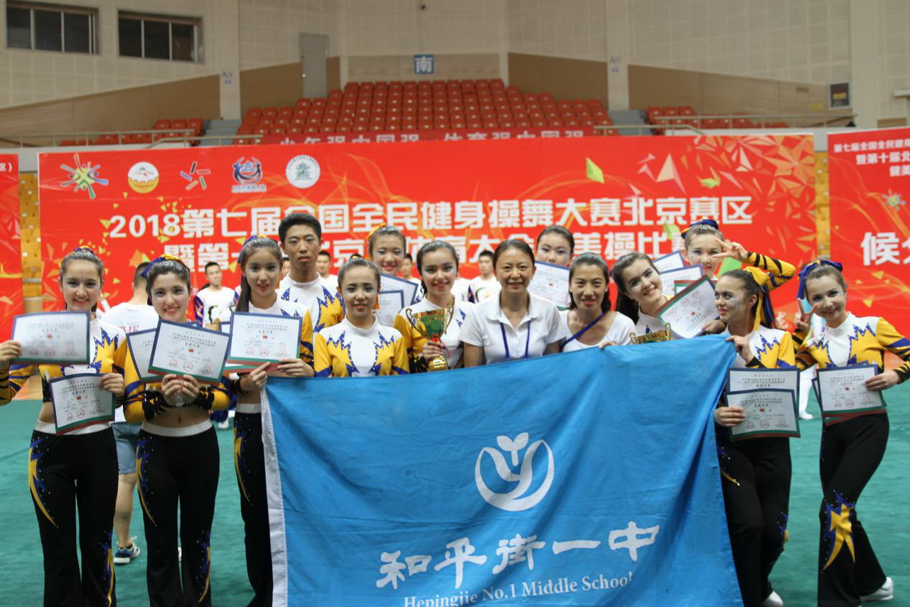 2018年5月19日和20日,和平街一中健美操队、舞蹈队在高婕、于露、王磊和沙金老师的带领下,分别参加了第七届全国全民健身操舞大赛暨第十届北京市体育大会健美操比赛和北京市中小学阳光大众健美操比赛。比赛中,学生们发挥出色,分别获得小学组有氧踏板操一等奖、少年组民族健身操藏族舞一等奖、大众健身操二级和全民健身操有氧四级一等奖。本次比赛,竞赛规则发生很大改变,首次允许社会培训机构的半专业队参赛。学校健美操队、舞蹈队面对这些半专业队伍和人大附中、北大附中、清华附中、首师大附中等134支优秀参赛队、近2000名运动员的激烈竞争,不畏强敌,发挥出色,收获了五个一等奖和最佳组织奖,为学校争得了荣誉。