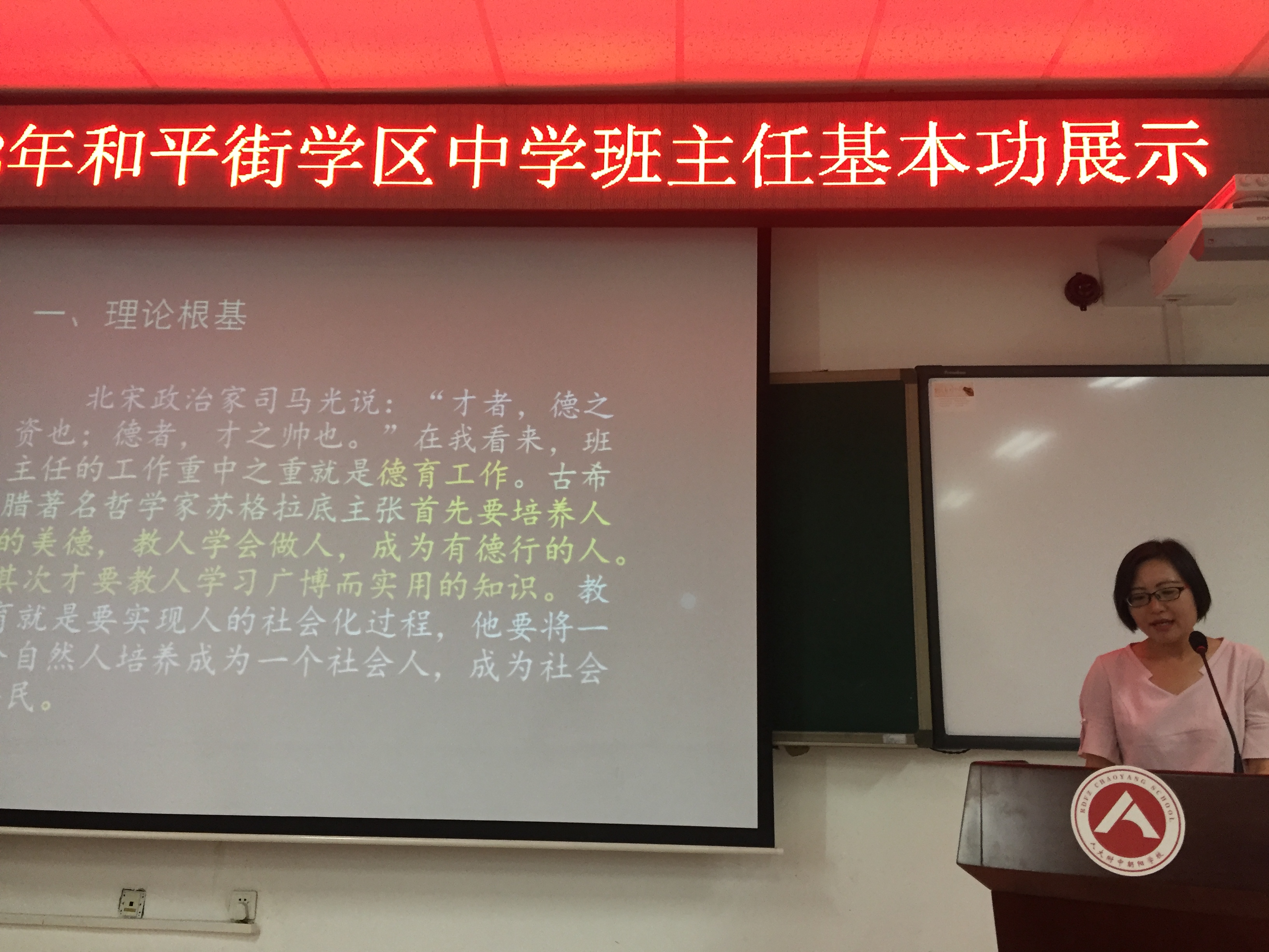 在朝阳区教委大力重视班主任队伍建设的大好形势下,为进一步探索新形势下班主任队伍建设的新途径、新方法,推进班主任队伍专业化发展,2018年5月24日下午,和平街学区在人大附中朝阳学校召开了“第二届班主任基本功展示”活动。通过学区内各校推荐、选拔,包括和平街一中初中夏曼青老师、高中王瑞雪老师在内的共计9名优秀班主任进入了和平街学区的最后决赛。参与本次活动的还有片区各校德育干部、部分老师。