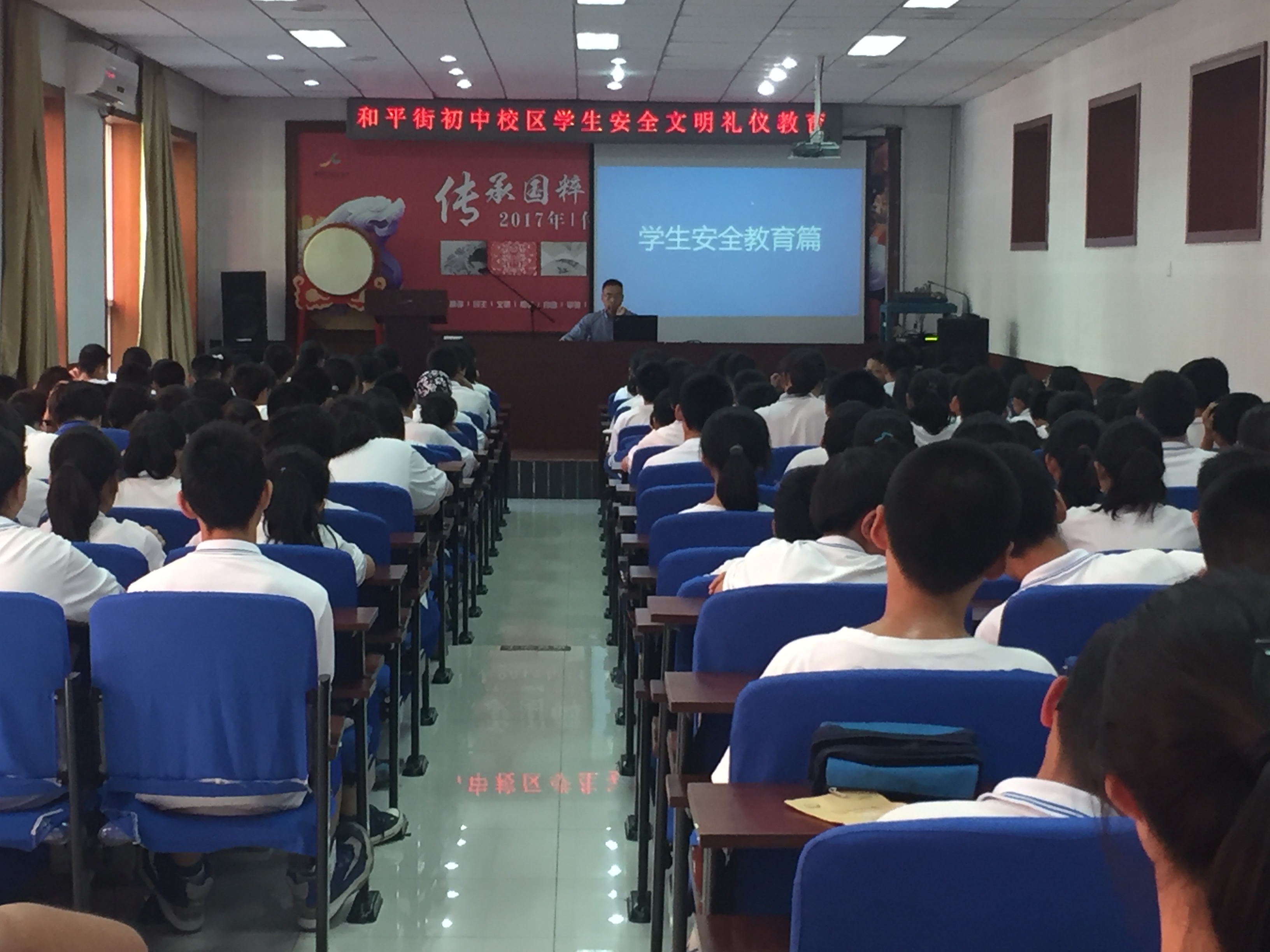 2018年5月29日,距离初中同学到新校区已经一周多,下午第八节课,和平街一中和平街初中校区德育处组织初一、初二年级全体同学在礼堂召开学生安全教育、文明礼仪教育会。会议由德育处张信海主任主持。