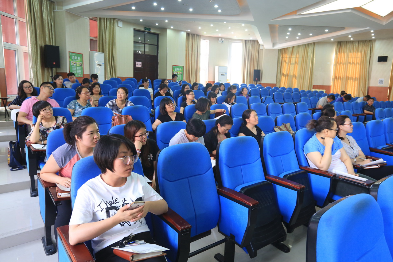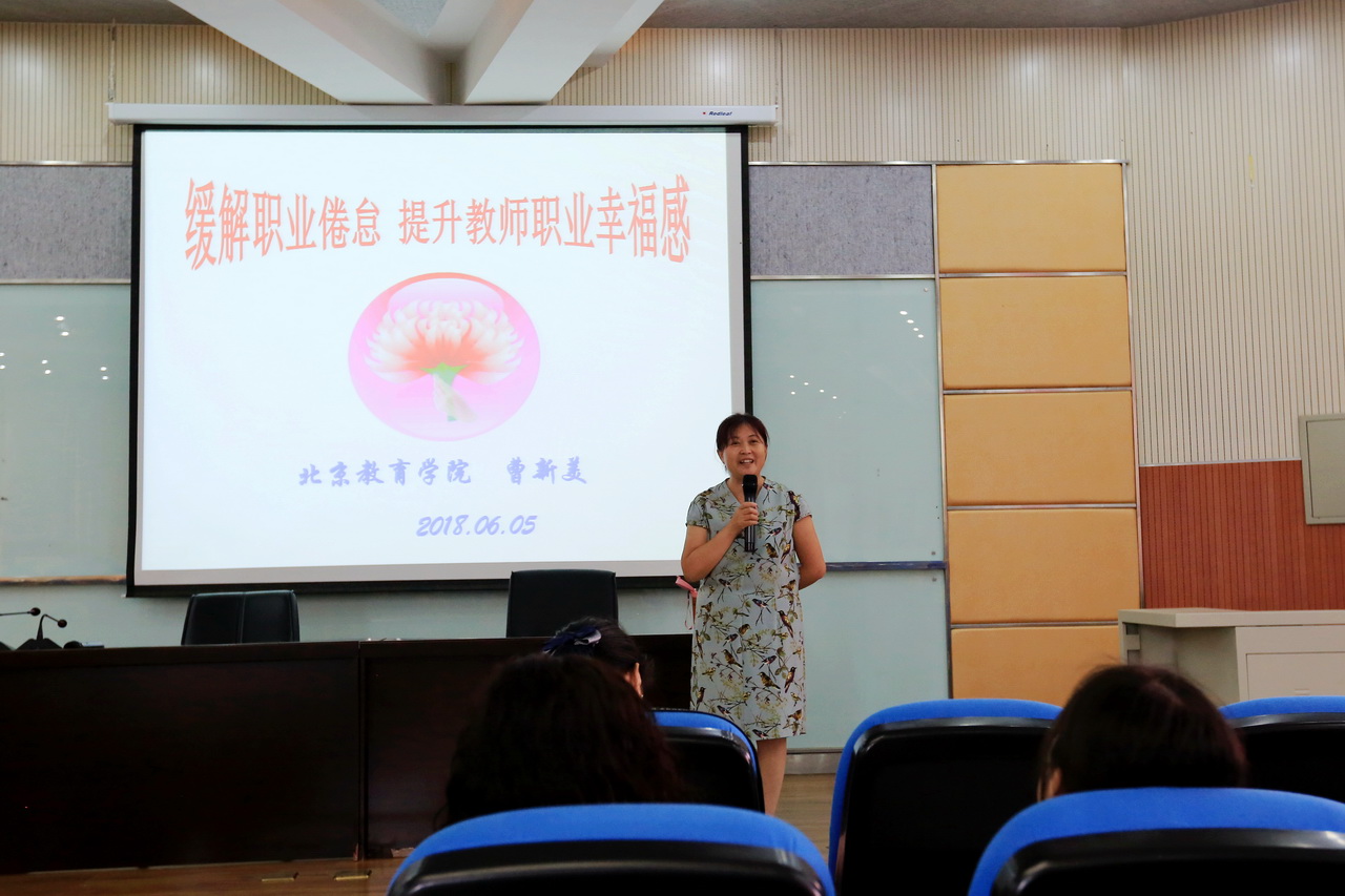 北京教育学院的曹新美教授从小调查“测测幸福感”入手,调动了老师们的参与热情。随后,曹教授重点讲述了“什么是职业倦怠”以及“如何提升教师职业幸福感”。曹教授用一个个鲜活的实例告诉老师们,学生喜欢的教师是什么样的?教师应该把幸福带入课堂中,多肯定学生,学会夸学生,给学生自信的支点;并建议教师们多进行学习,做好未来的职业规划。讲座过程中,教师们认真记录,积极参与互动。