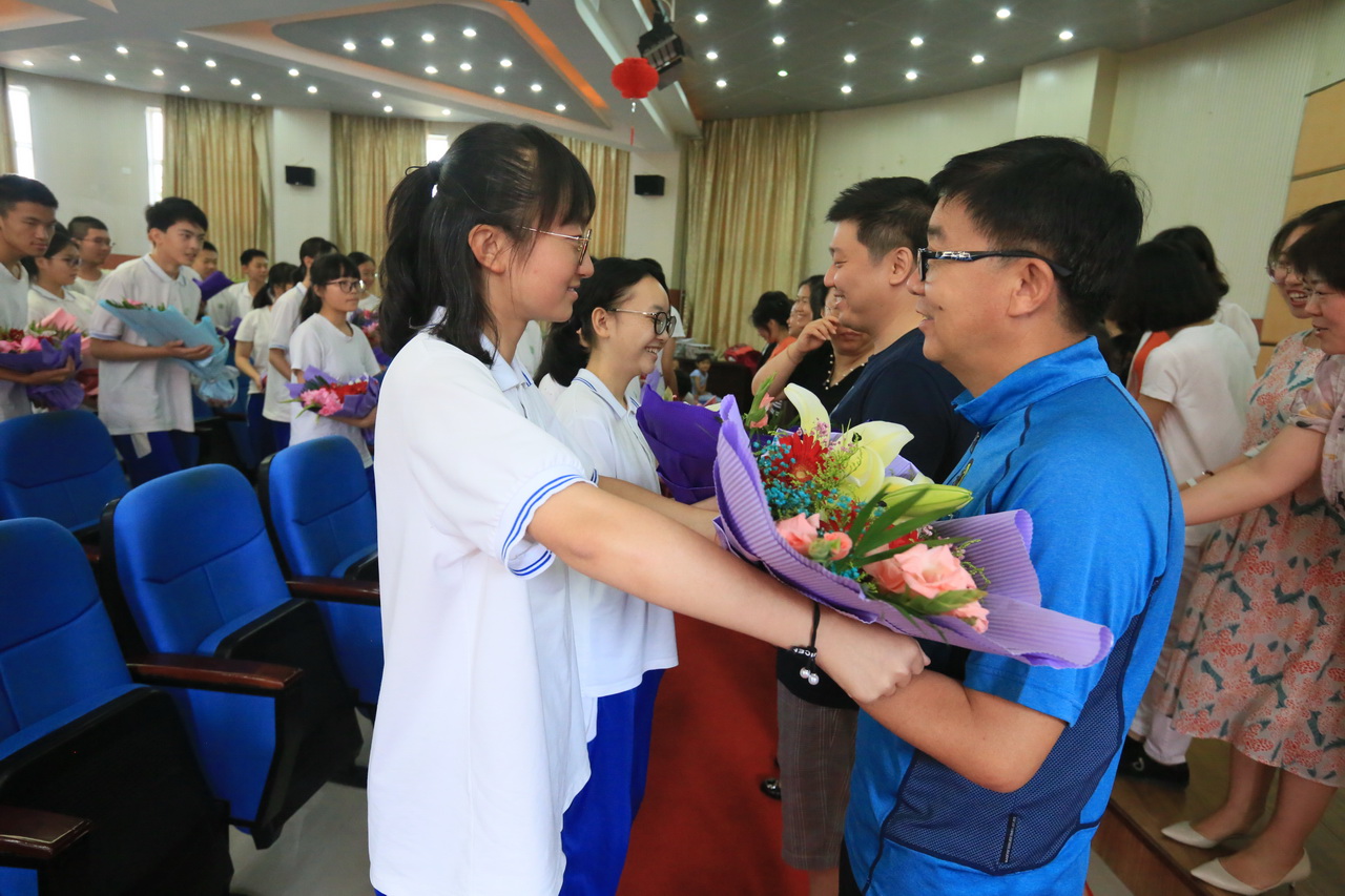 毕业典礼在庄严的国歌声中开场。师生们一起观看了初三年级组精心制作的视频。一幅幅照片、一个个镜头、一段段音乐勾起了同学们无限美好的回忆。忆及在和一的点点滴滴,每个人都变得越来越成熟,让人不由得感叹时光如梭,当初懵懂的少年已经蜕变为现在的有志青年。曹高仁书记给同学们送上了毕业寄语,鼓励同学们做知感恩、有追求、有自信、有担当的人。初三老师们发表了对学生们的殷切希望。初三毕业生代表范浩鑫同学声情并茂地表达了对于母校的不舍,对老师们的感谢,并表示会继续留在和一学习。在和一生活了12年的高三优秀毕业生代表张越同学与初三学子们分享了高中学习生活经验,并把高中生活用几个关键词进行了概括:熟悉、舒适、自由以及敬业。随后,学校领导为学生颁发毕业证书,毕业生代表向母校敬送纪念品,学生们向老师们献花表示感谢。最后,在熟悉的校歌声中,毕业典礼圆满结束。