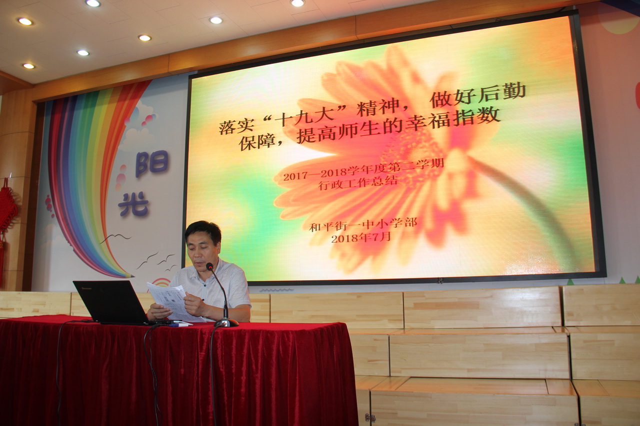 会上,德育主任张馨文、教学主任郎俊珠、副校长蒋文杰分别从德育、教学、行政三方面进行了工作总结。总务主任李波对校园安全工作、假期工作进行了布置。最后,校长助理陈立红做了总结性讲话。她对本学期工作进行了简要回顾,肯定了所取得的成绩,指出工作中的不足,她要求全体教职员工要加强学习、积极传递正能量,继续发扬无私奉献、团结协作的精神,勇往直前,争取更大的进步。