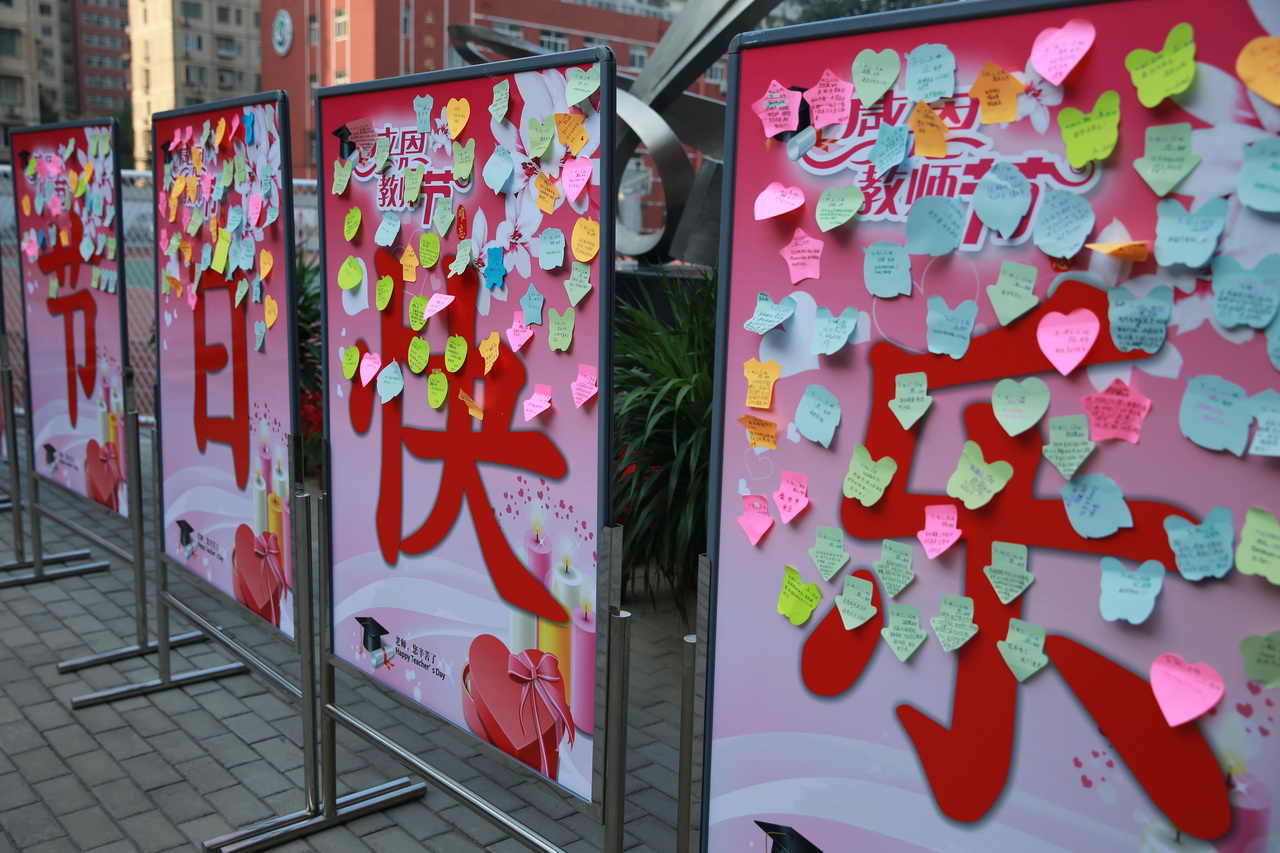 一大早,各校区就提前布置好了“感恩教师节展板”。伴随着悠扬的音乐,同学们陆续来到校门口,写下对教师的祝福,并亲手把它贴在“教师节纪念展板”上。由学生装扮成的吉祥物和每一位老师热情的拥抱,让老师们真切的感受到教师节的来临。朝来校区的同学们在前一天就将各班亲手折叠成串的千纸鹤挂在教职员工办公室门口两侧,中间贴上“教师节快乐”字样的祝福画。暖心的孩子们,还用“胶钉”设计成“心形”粘贴千纸鹤挂串和祝福画的四个角,表达对全体教职员工祝福的心愿!
