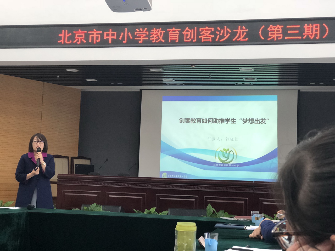 2018年10月24日,应北京青少年科技中心邀请,和平街一中学生发展二处主任韩晓佳及教师代表前往北京科学中心参加第三期北京中小学教育创客沙龙活动。本次活动的主题为“开放式创客教育交流平台的构建”。北京师范大学教授李亦菲、清华大学副教授洪亮和学校学生发展二处主任韩晓佳分别与“创客12+”成员单位以及来自北京五十中、北京中学等共计30余名教师进行交流。