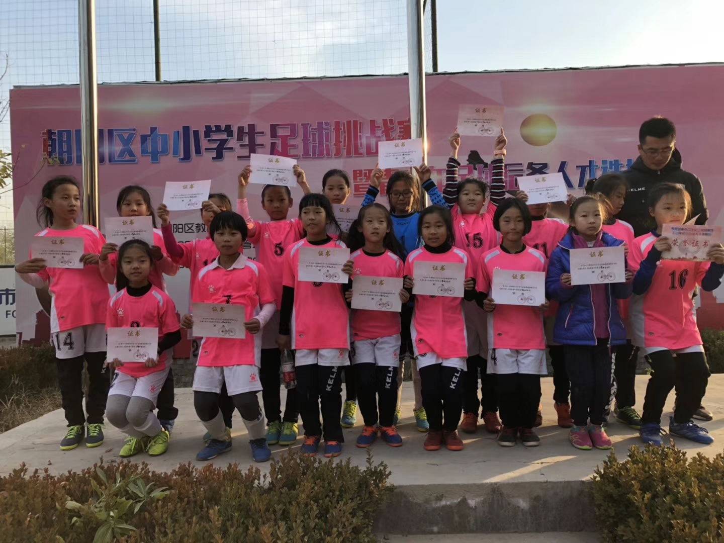 2018年11月11日至17日,和平街一中小学部女子足球队在体育教师娄梦楠老师的带领下,参加了2018年朝阳区中小学生足球挑战赛暨青少年足球后备人才选拔赛。赛场上,同学们顽强拼搏,英勇善战,最终以3胜1负的好成绩获得朝阳区小学女子乙组比赛亚军。体育教师娄梦楠荣获优秀教练员称号。在此,向获奖学生和老师表示祝贺!