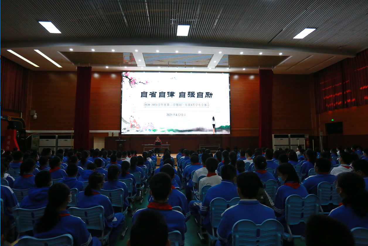2021年4月13日下午班会时间,朝来校区初一年级组织了题为“自省自律·自强自励”月例会,学年组长陈立娟老师主持,全体初一学生和班主任参加会议。